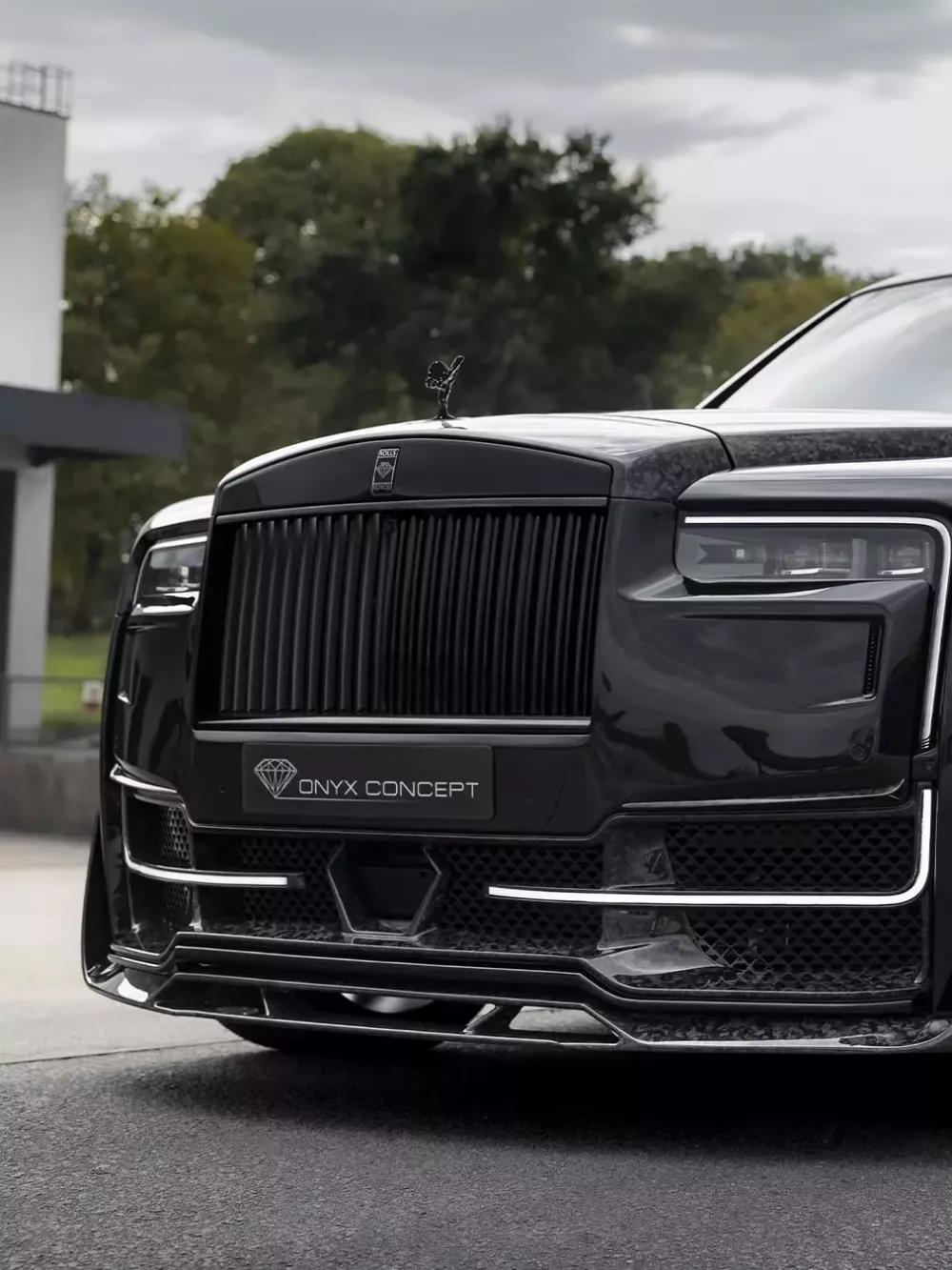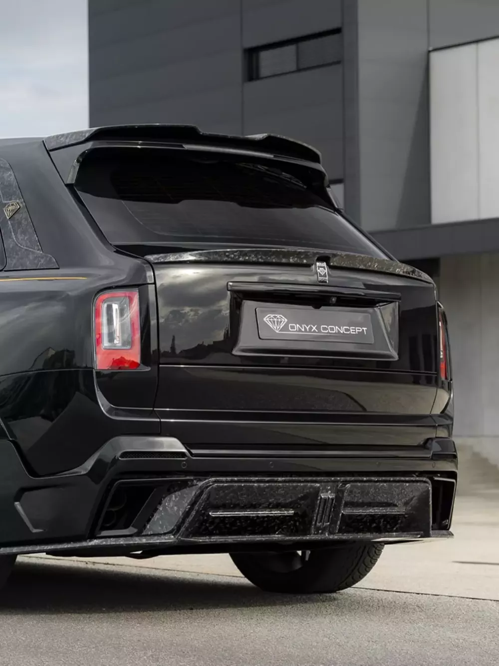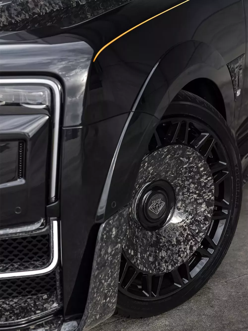 Chiếc Cullinan phiên bản Onyx, về cơ bản đã được khoác lên mình lớp vỏ bằng sợi carbon rèn cao cấp. Nắp ca-pô, bộ chia gió phía trước và cản trước, cũng như khung lưới tản nhiệt, đều được phủ bằng vật liệu độc đáo này. Và đó chưa phải là tất cả. Ốp sườn, cản sau, bộ khuếch tán gió và mâm xe cũng được xử lý bằng phương pháp rèn carbon.