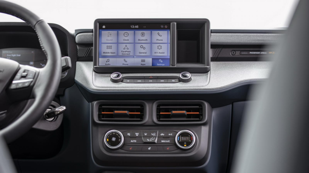 Bên trong khoang lái Ford Maverick sở hữu hệ thống giải trí với màn hình 8 inch, tương thích trình kết nối Apple CarPlay và Android Auto. Vận hành hệ thống này sẽ là tính năng FordPass Connect đi kèm tính năng phát sóng Wifi cho phép kết nối tối đa 10 thiết bị. Khách hàng có nhu cầu cao hơn có thể nâng cấp lên tùy chọn hệ điều hành SYNC3 trên bản trang bị Lariat.