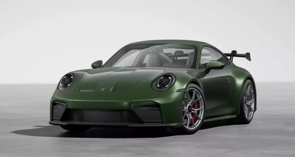 Một chiếc Porsche 911 GT3 2025 với màu sơn xanh lá cây sồi ánh kim tuyệt đẹp, cũng là xe Porsche đầu tiên mà ông Evans sở hữu.