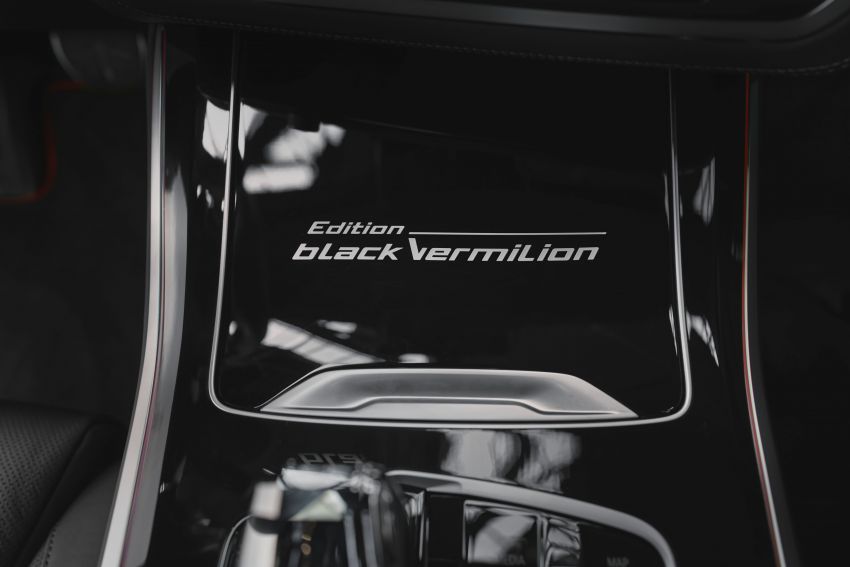 Bên trong khoang lái, tất cả các mẫu X5 và X6 Black Vermilion đều có nội thất màu đen với trần xe phủ da Alcantara, logo đặc biệt ở hộc để cốc, cần điều khiển bọc kính Crafted Clarity, ốp gỗ Fineline Black màu đen với các chi tiết điểm nhất bằng nhôm. Toàn bộ cabin của xe đều được mọc da Merino Black đi kèm các chi tiết điểm nhấn màu đỏ, đi kèm là thảm sàn đen viền đỏ tương tự như màu ngoại thất. Ngoài bộ phanh M Sport, các bản Black Vermilion còn được nâng cấp lên hệ thống xả M Sport, hệ thống treo thích ứng M Suspension và cản sốc M Sport.