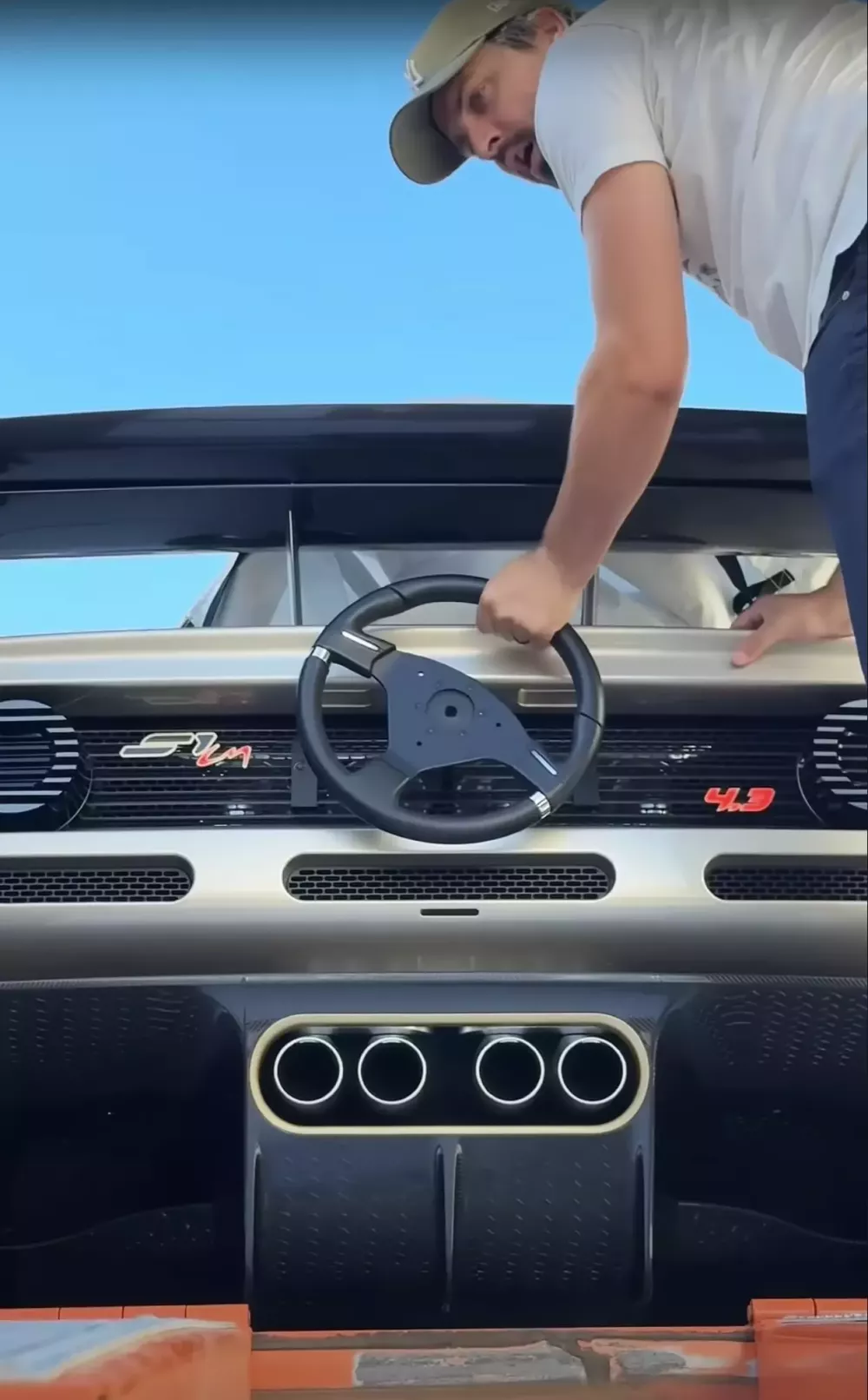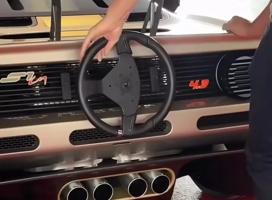 Điều đặc biệt thú vị là chi tiết nhỏ này hé lộ những vấn đề thực tế của việc trưng bày xe hơi độc đáo. Bạn có thể chế tạo một chiếc vỏ xe tuyệt đẹp, nhưng nếu không nghĩ ra cách di chuyển nó khi xe không thể nổ máy, thực sự rất khó khăn. Vì thế, sự hiện diện của vô lăng gắn phía sau sẽ giúp việc vận chuyển dễ dàng hơn.