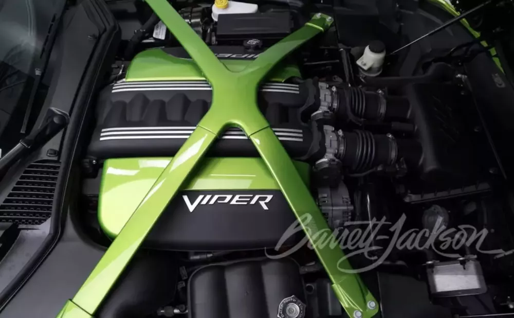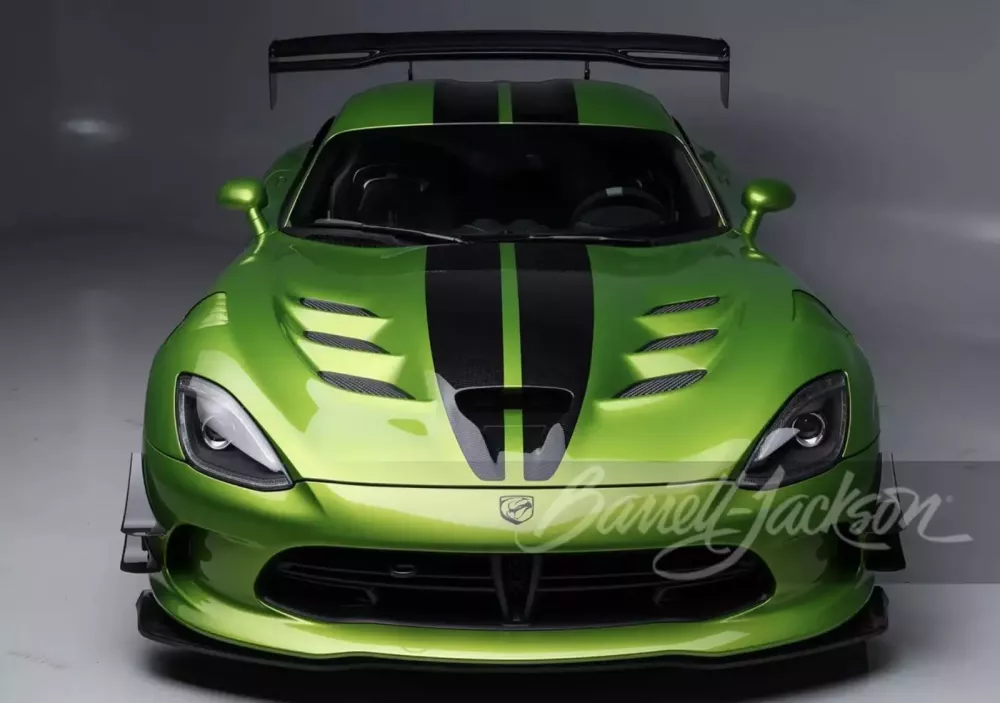 Màu sơn đặc trưng, một màu xanh lá cây khiến người ta phải dừng lại giữa chừng. Kết hợp với sọc SRT họa tiết da rắn chạy dọc thân xe, tạo nên một tổng thể ấn tượng hơn: một sự tôn vinh dành cho mẫu Snakeskin ACR 2010 và một lời tri ân đến di sản hoang dã hơn của Viper.