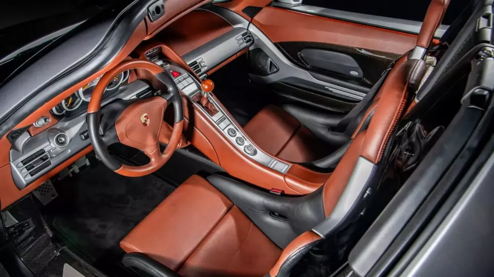 Chiếc Carrera GT gần như chưa qua sử dụng này có màu bạc GT Silver Metallic (một trong năm màu sắc ban đầu của dòng xe này) kết hợp với nội thất da màu nâu Ascot Brown và đen Natural Black, và được trang bị sẵn từ nhà máy với ghế kiểu thể thao, điều hòa chỉnh tay và hệ thống âm thanh Bose. Một đầu CD radio của Porsche và một bộ hành lý chính hãng được thiết kế phù hợp với nội thất cũng được bao gồm.