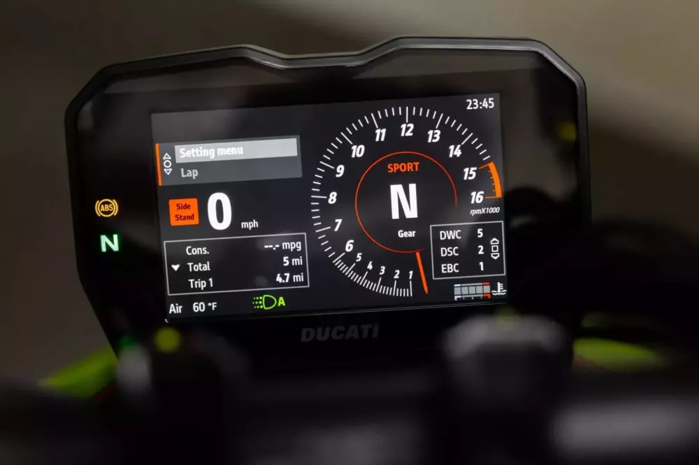 Khi đã ngồi lên xe, chắc chắn bạn sẽ thích tay lái hoàn thiện màu đen với cụm tay phanh Brembo bằng nhôm đúc, cũng như gương chiếu hậu kép, tạ đầu tay lái, ốp táp-lô bằng sợi carbon, màn hình TFT 5 inch hiển thị quãng đường đi được 5 dặm, cùng nhiều tính năng an toàn chủ động và chế độ lái như ABS, kiểm soát lực kéo, bốc đầu, trượt và phanh động cơ.