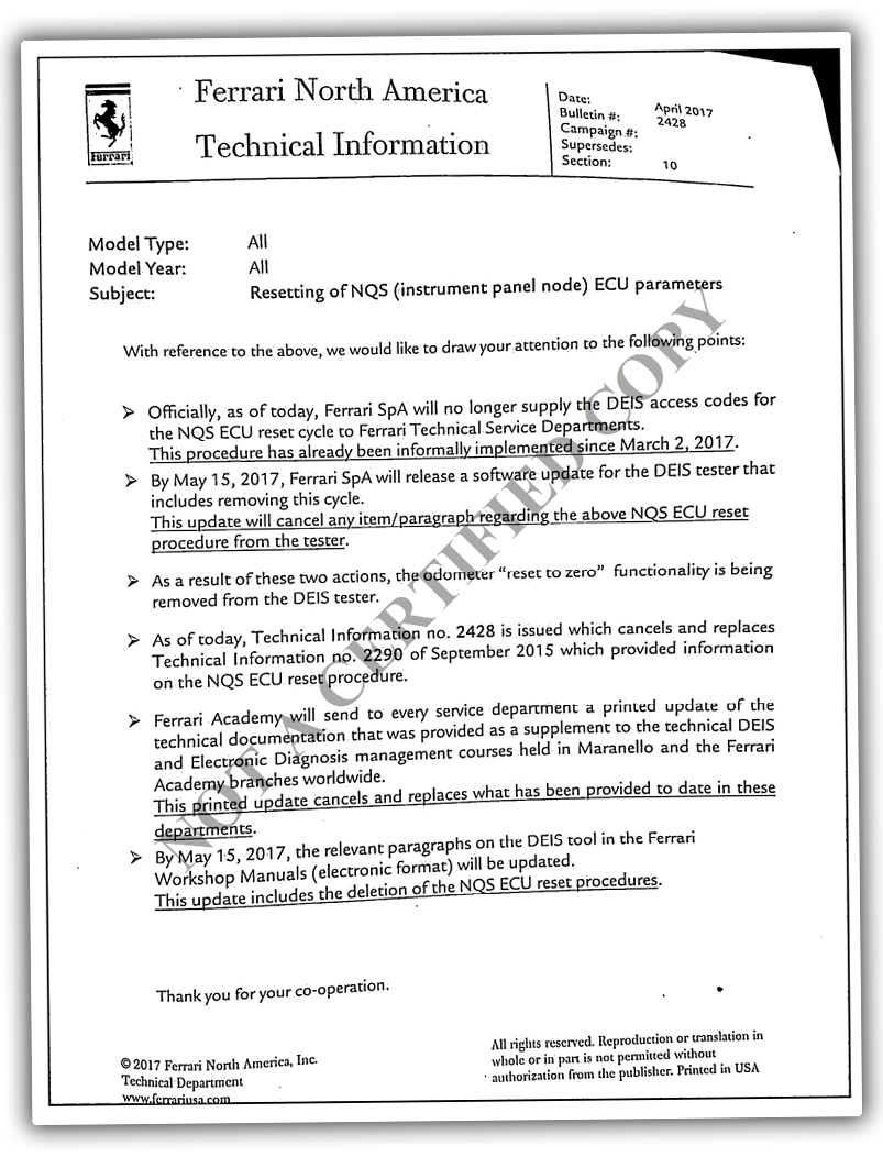 Nhìn vào những gì được viết trong bản ghi chú, người ta hoàn toàn có thể nói rằng Ferrari có biết chuyện đồng hồ công-tơ-mét có thể được tua lại thông qua công cụ kiểm tra DEIS. Bản ghi chú cũng gợi ý rằng bản hướng dẫn Ferrari Workshop Manuals cũng đã được biên tập để bỏ đi đoạn văn miêu tả cách tua lại công-tơ-mét.
