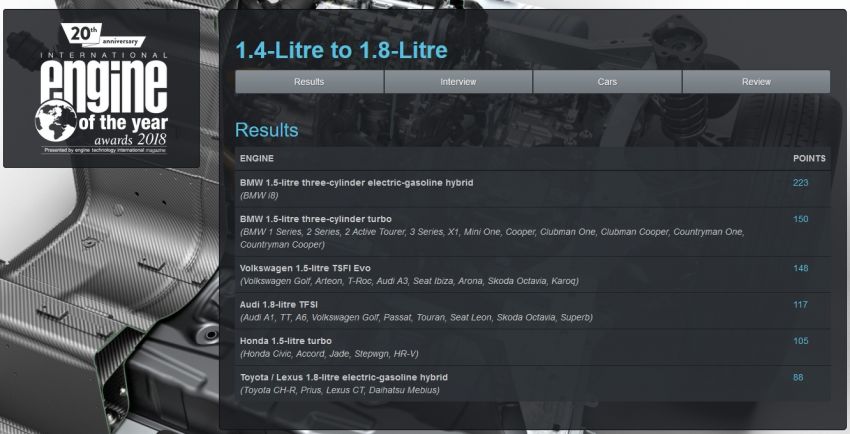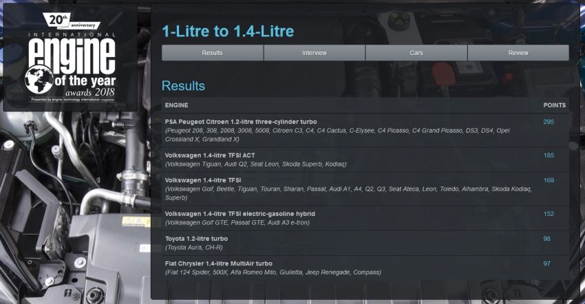 Ở hạng mục 1 lít tới 1.4 lít, PSA Peugeot Citroen đã giành chiến thắng trước 3 đối thủ cùng của Volkswagen, trong khi hạng mục 1.4 lít tới 1.8 lít lại có thắng cuộc là một động cơ tăng áp hybrid, dung tích 1.5 lít của BMW.