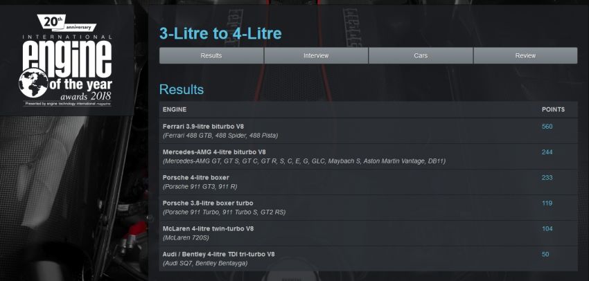 Porsche đã ẵm giải ở hạng mục 1.8 lít tới 2.0 lít với mẫu động cơ tăng áp, dung tích 2.0 lít đang có ở mẫu 718 Boxster và Cayman, trong khi động cơ tăng áp 5 xi-lanh, dung tích 2.5 lít của Audi đã là người chiến thắng trong hạng mục 2 lít tới 2.5 lít. Porsche đã có thêm một chiến thắng ở hạng mục 2.5 lít tới 3 lít năm nay nhờ có động cơ tăng áp 6 xi-lanh, dung tích 3.0 lít trên mẫu 911.