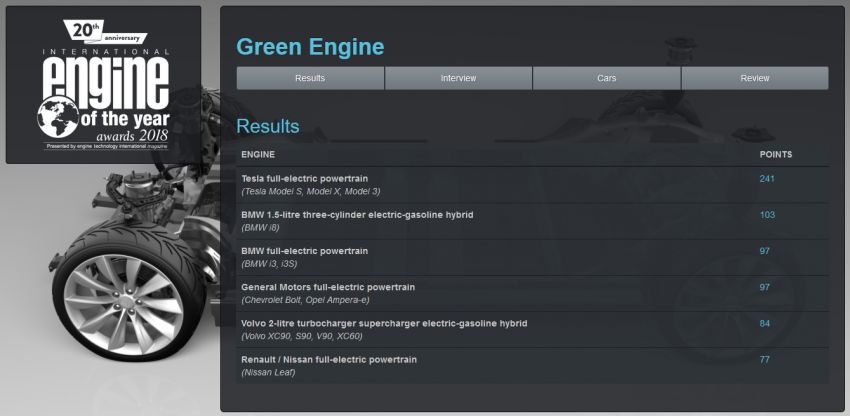 Hai hạng mục cuối cùng là Hệ dẫn động Điện và Động cơ Xanh, và Tesla đã giành cả hai với hệ dẫn động điện thuần túy tân tiến của họ, qua mặt đối thủ BMW với hệ dẫn động điện trên i3 và động cơ tăng áp hybrid 3 xi-lanh, dung tích 1.5 lít trên i8.
