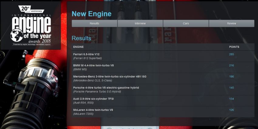 Giống như trước đây, Giải thưởng Động cơ Quốc tế của Năm 2018 vẫn có tất cả 13 hạng mục thi đấu, và ngoài các chiến thắng của Ferrari, những hạng mục khác đã có người chiến thắng tới từ những nhà sản xuất khác. Cụ thể hơn, Volkswagen đã chiến thắng ở giải thưởng Động cơ Dung tích 1 lít trở xuống với động cơ tăng áp 3 xi-lanh, dung tích 1.0 lít của họ.
