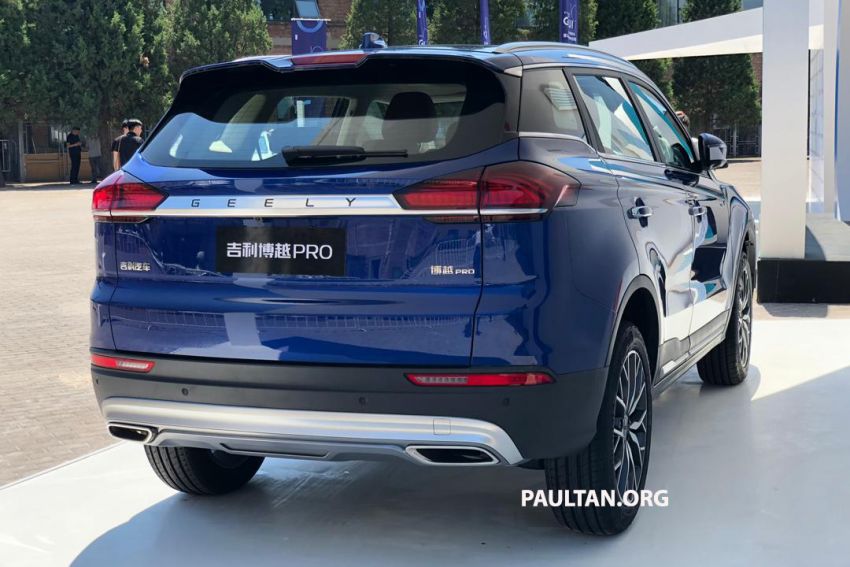 Ở phía sau, cụm đèn hậu đã được chỉnh lại một chút để tương xứng với các đường gân của Boyue hơn, và chúng cũng nhận được đồ họa ánh sáng cập nhật mới. Không còn logo Geely ở phía sau nữa, thay vào đó là một hàng chữ Geely viết trên một tấm ốp crôm bóng bẩy. Phía sau xe cũng có một thiết kế cánh gió trên nóc mới. Một điểm đáng nói khác là thiết kế cho phần dưới của phía sau của Boyue Pro đã trở nên đơn giản và liền mạch hơn so với trước kia. Bộ la-zăng 19-inch họa tiết mạng nhện mới trông cũng khá bắt mắt.