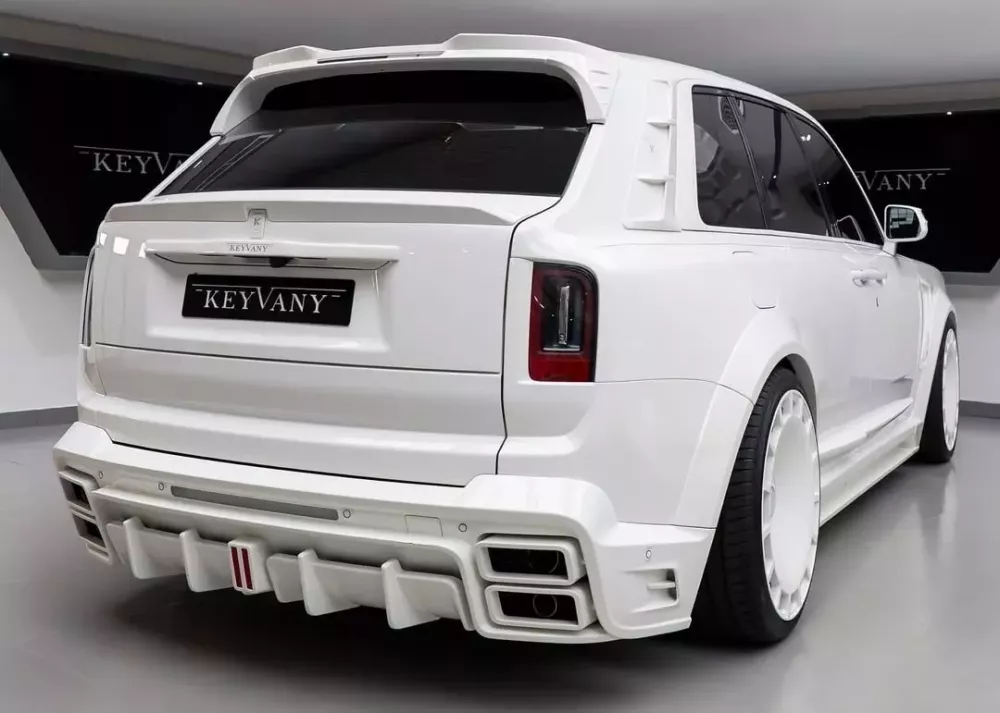 Phía trước, chiếc Rolls-Royce Cullinan này, được Keyvany gọi là Hayula II, sở hữu cản trước mới hầm hố hơn và được bổ sung thêm đèn chạy ban ngày. Lưới tản nhiệt ấn tượng vẫn được giữ nguyên, và logo trên đó dường như khắc họa tên hãng độ. Ngoài ra còn có cản trước mới với các cánh gió bên, và một điểm tích cực hơn là biểu tượng Spirit of Ecstasy vẫn được giữ nguyên.