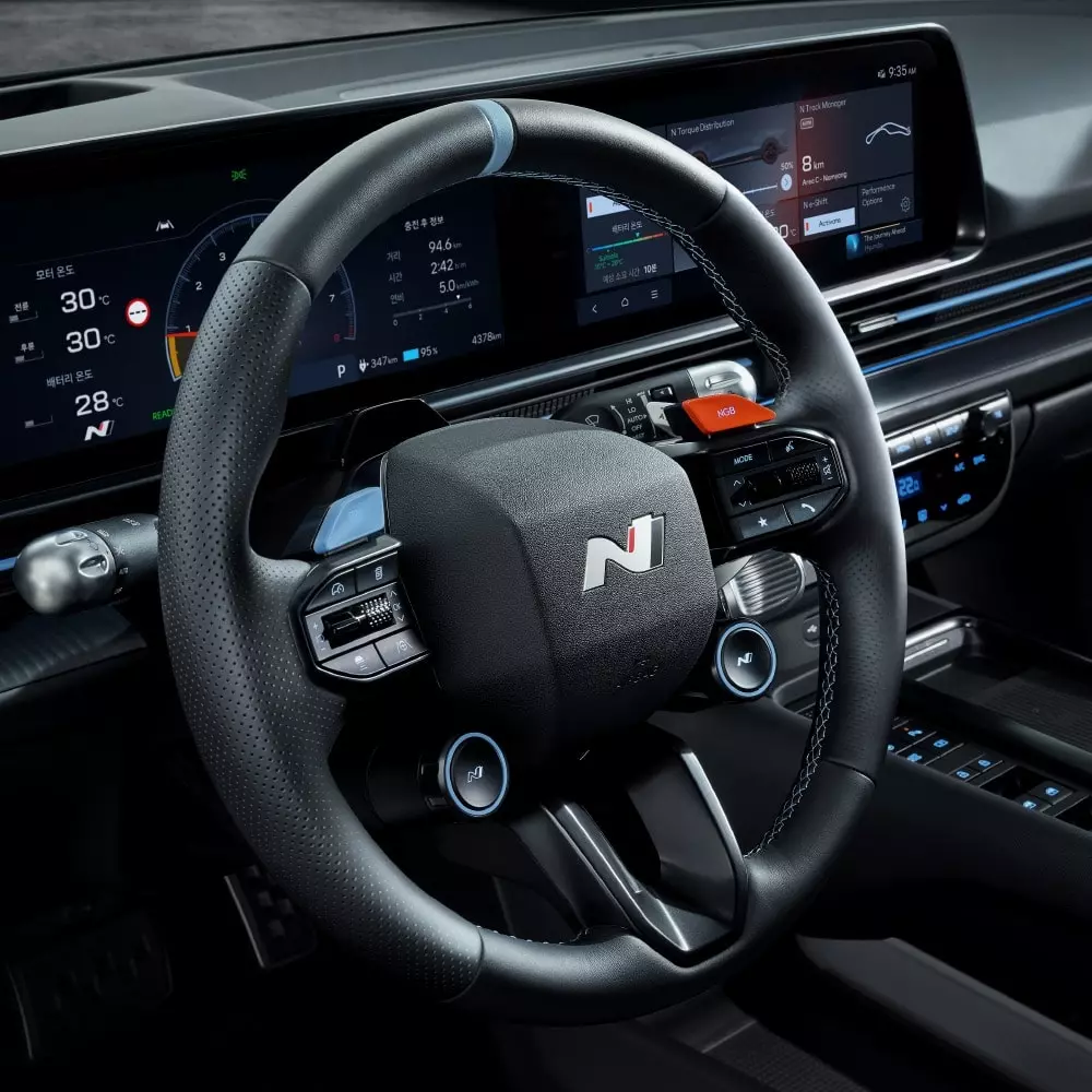 Vô lăng rèn có trọng lượng 13,1 kg. Khách hàng mua Ioniq 6 N còn được tặng thêm vô lăng bọc da Pasubio với điểm nhấn màu xanh Performance Blue ở giữa. Nội thất cũng được nâng cấp với ốp bảo vệ bằng sợi carbon, bảng điều khiển trung tâm bọc da lộn và thảm sàn mang thương hiệu.