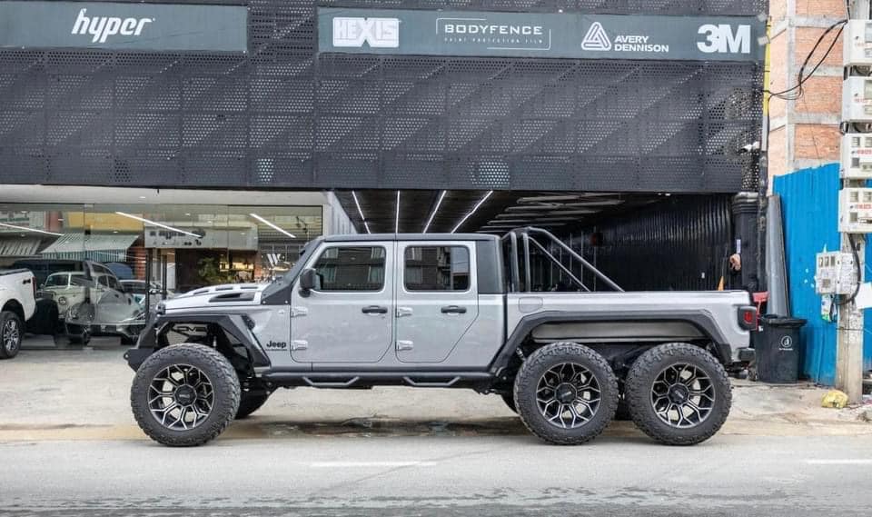 Xe bán tải Jeep Gladiator là niềm cảm hứng không nhỏ cho các hãng độ biến nó thành mẫu xe có hệ dẫn động 6x6, điều này khiến Jeep Gladiator trông hầm hố và dữ dằn, bản độ Jeep Gladiator 6x6 đang rao bán với khách hàng Việt còn được sửa đổi kha khá ngoại thất bao gồm mặt tiền phía trước như các mẫu xe bọc thép, vòng ra bên hông xe, Jeep Gladiator 6x6 này có 6 bánh xe độ của hãng Weld, dàn phuộc đến từ thương hiệu nổi tiếng King Shock.
