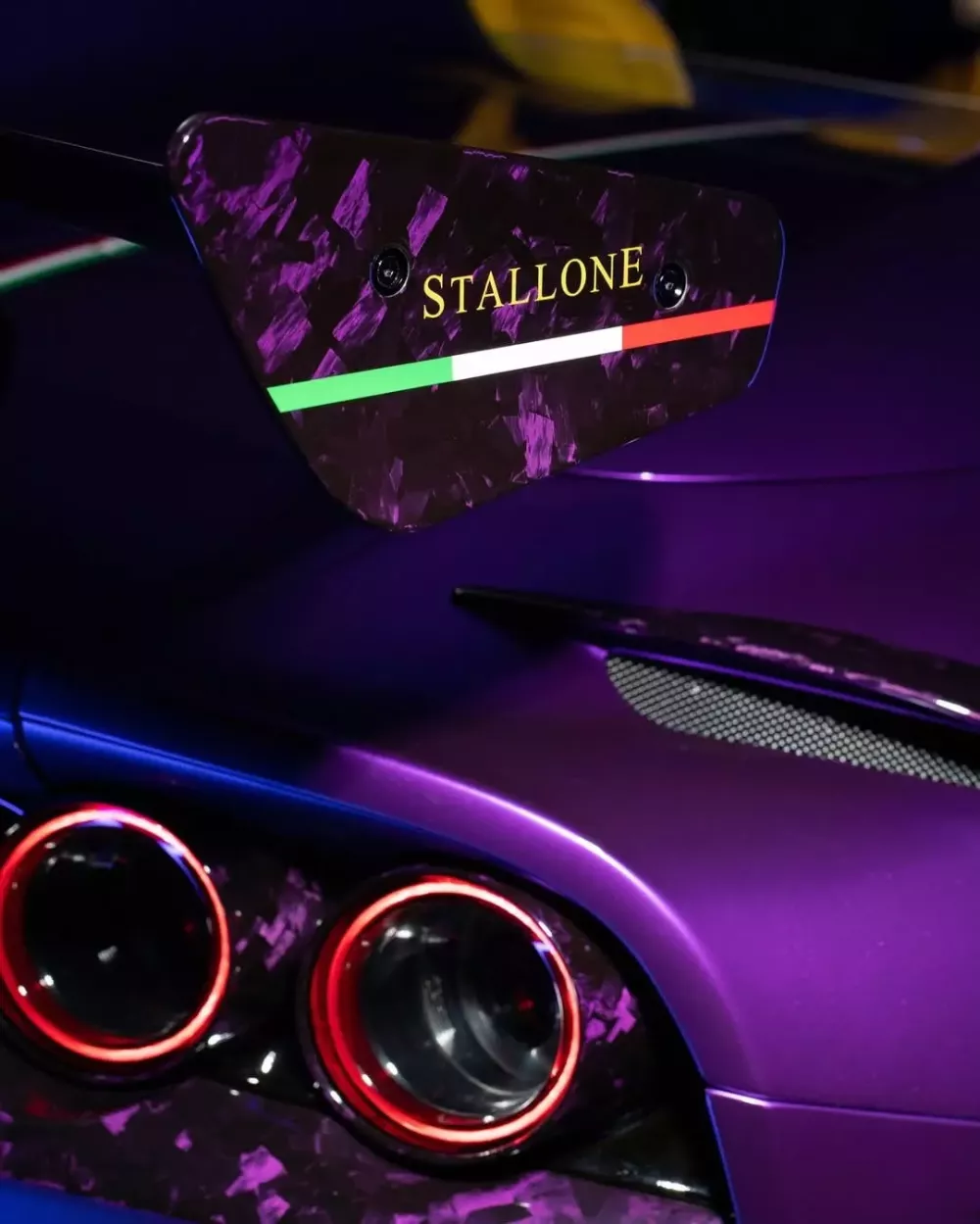 Chiếc Ferrari 812 Superfast này dường như cũng được trang bị cánh gió đuôi vịt nhiều mảnh, cùng với các chi tiết khác góp phần tạo nên dáng vẻ dữ dằn. Bạn còn nhớ họa tiết cờ Ý không? Hóa ra nó chạy từ đầu ra sau, tạo nên sự tương phản với màu tím chủ đạo.