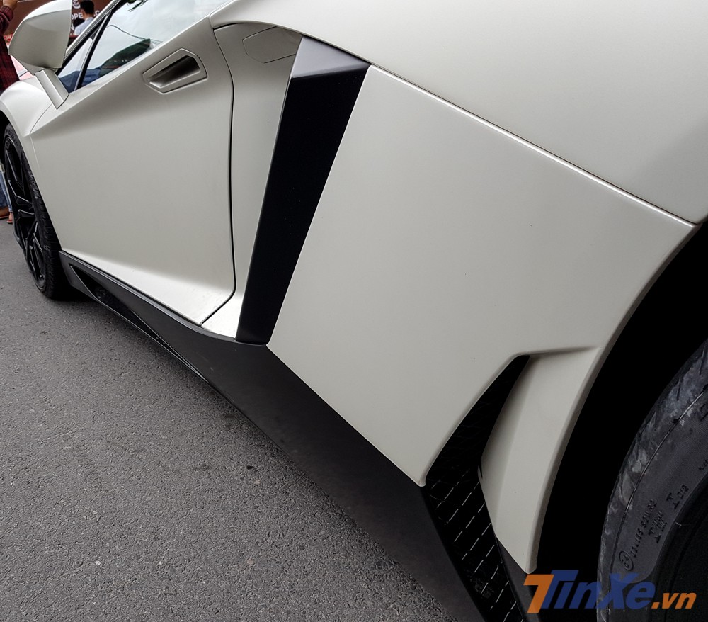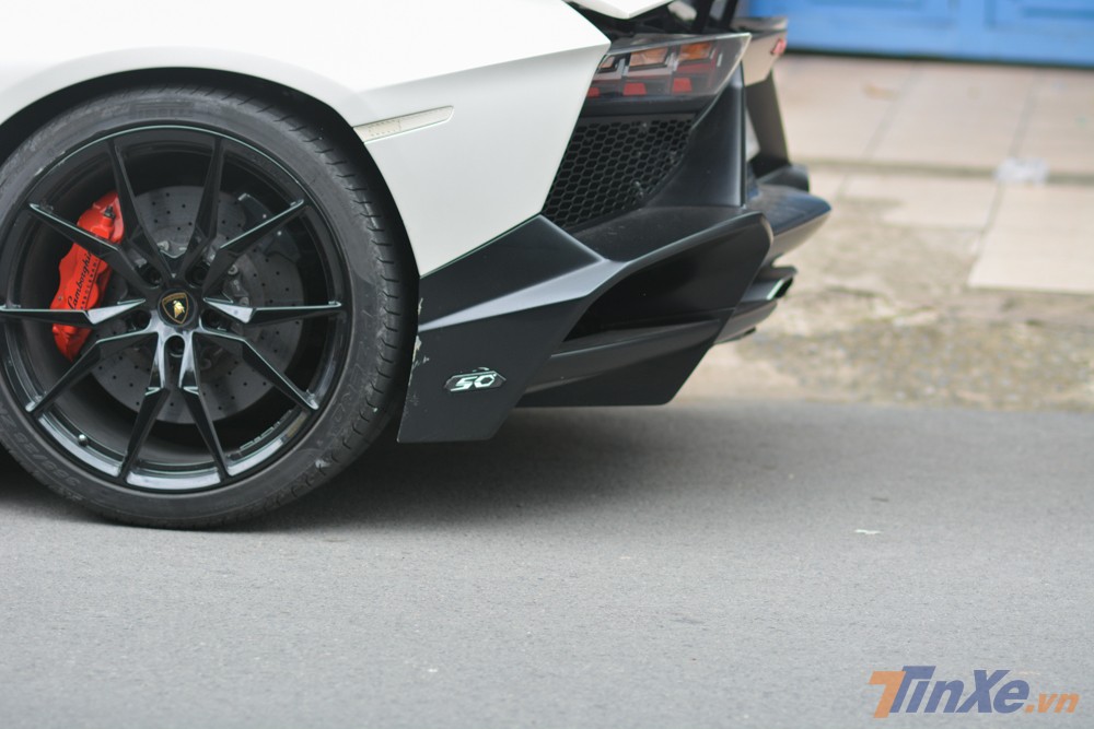 Những chi tiết độ theo bộ body kit Lamborghini Aventador LP720-4 50º Anniversario trên siêu xe Lamborghini Aventador LP700-4 này được sơn lại màu đen nhám đối lập màu sơn trắng mờ của xe. Ngoài ra, phần đuôi siêu xe này cũng được nâng cấp theo body kit Lamborghini Aventador LP720-4 50º Anniversario với các hốc gió cắt xẻ cá tính, cản va sau hầm hố hơn. Bên hông cản va sau những chiếc siêu xe Lamborghini Aventador LP720-4 50º Anniversario có đánh số 50 để tạo sự nhận biết. Nẹp sườn cũng có thêm logo LP720-4