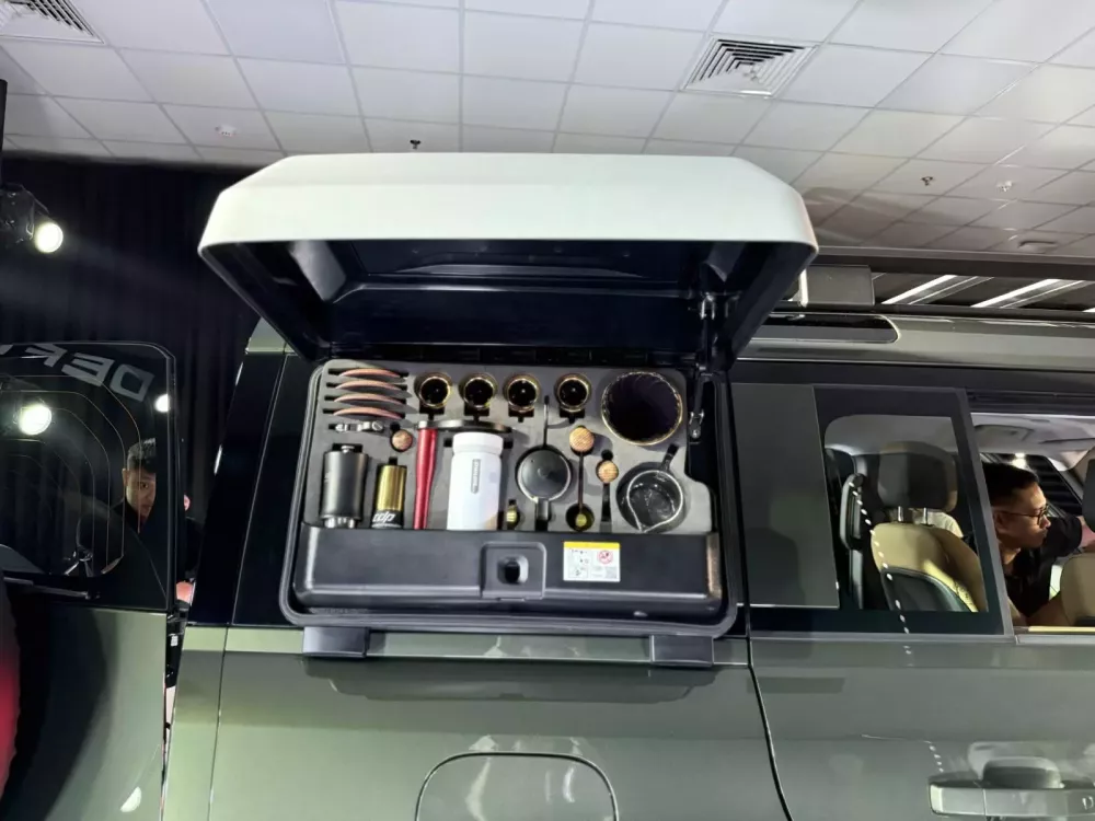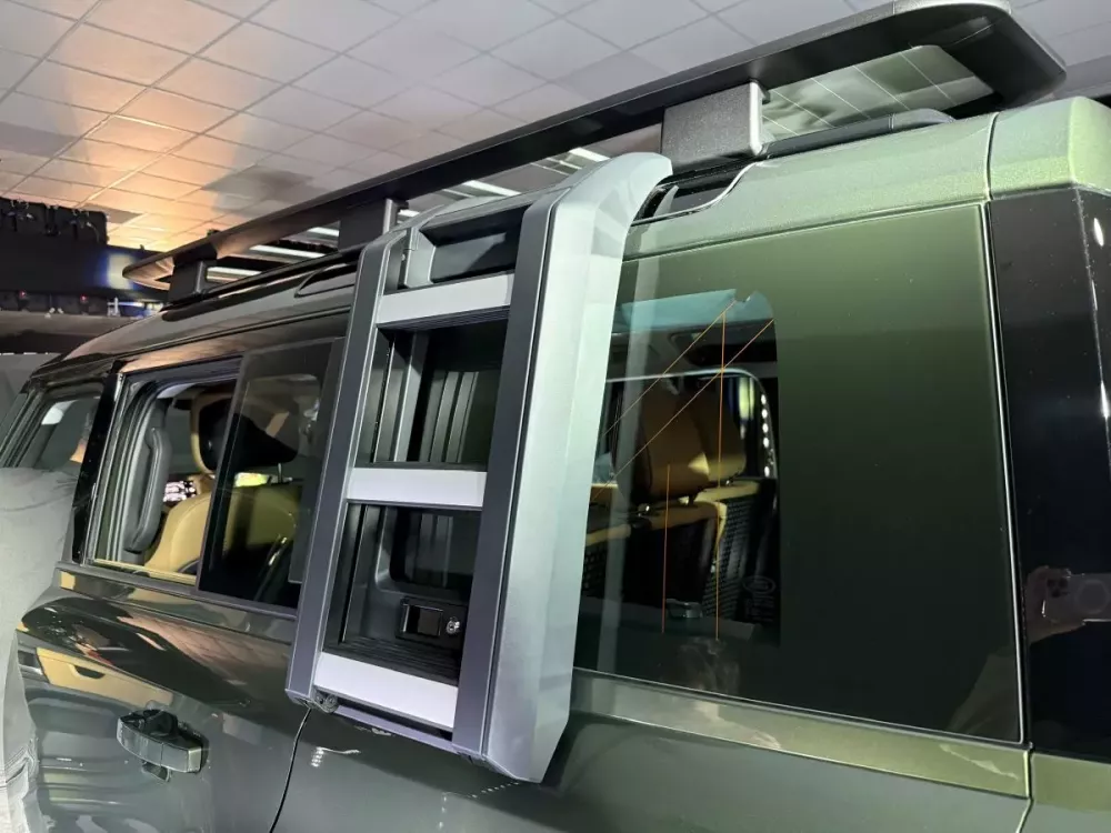 Defender 2026 bản trưng bày tại sự kiện ra mắt xe được bổ sung gói phụ kiện off-road gồm hộp giữ đồ bên hông, giá nóc, thang hông và bệ bước cố định, chắn bùn classic.