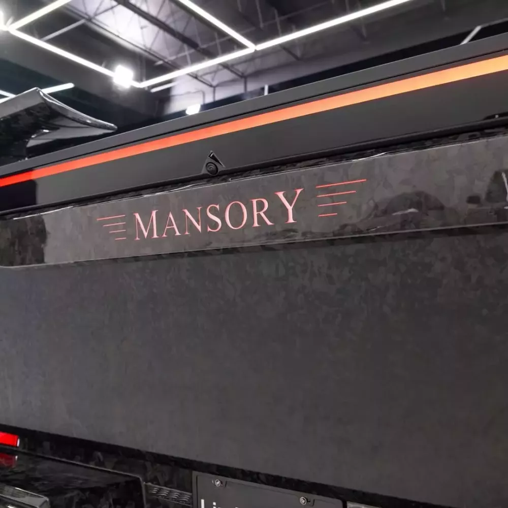 Ở phía sau, xe được trang bị bộ khuếch tán mới khá vuông vức, theo sát đường nét của Tesla Cybertruck, cùng với một chi tiết hình cánh kép, tên Mansory được chiếu sáng ở giữa cửa hậu và một đèn phanh phụ ở phía dưới.