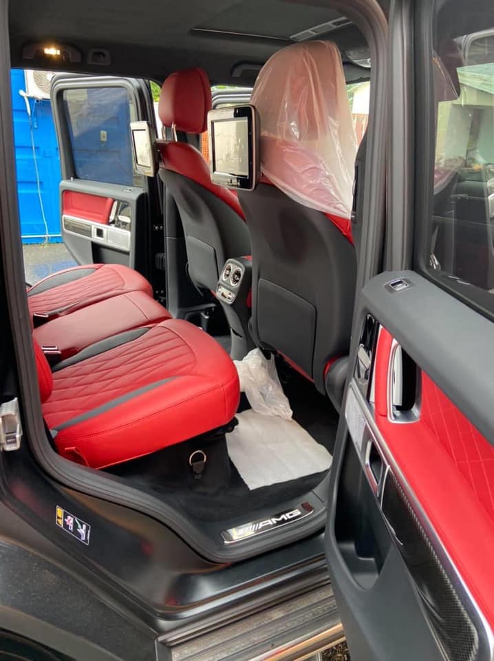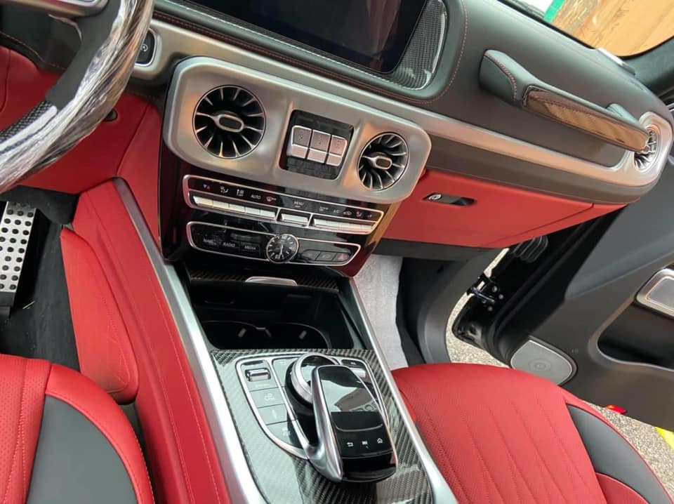 Bên cạnh la-zăng đẹp mắt, chiếc SUV hạng sang Mercedes-AMG G63 có gói tuỳ chọn off-road Trail Package đầu tiên ở Việt Nam sở hữu ngoại thất màu đen mờ đi kèm viền đỏ ở vỏ gương hay bộ tem 3 sọc bên hông xe rất giống với phiên bản Mercedes-AMG G63 Edition One. Bên trong khoang lái của xe có nội thất màu đỏ cùng nhiều chi tiết bọc sợi carbon rất khoẻ khoắn.