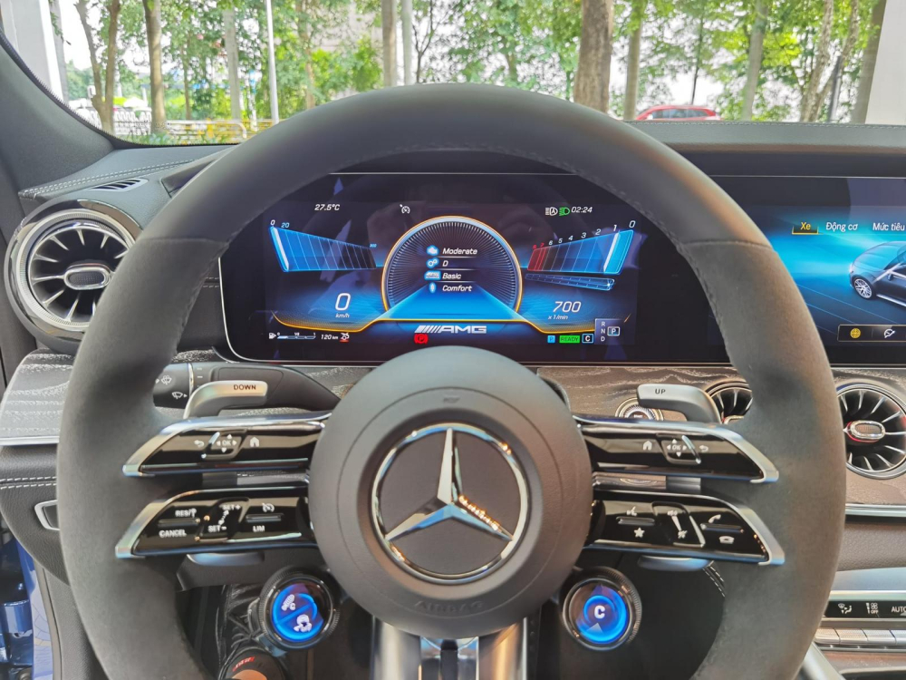 Tiến vào bên trong khoang lái dễ thấy Mercedes-AMG GT 53 4Matic bản nâng cấp giữa vòng đời có nhiều chi tiết đáng chú ý như vô lăng 3 chấu AMG Performance mới, bọc da Nappa/vi sợi DINAMICA với các nút điều khiển cảm ứng. Phía sau vô lăng là bảng đồng hồ kỹ thuật số với màn hình hiển thị 12,3 inch. Màn hình thông tin giải trí trung tâm 10,25 inch có hệ thống MBUX thế hệ mới, kết nối Bluetooth, chức năng điều khiển bằng giọng nói LinguaTronic và kích hoạt thông qua câu lệnh “Hey Mercedes”, tất nhiên có hỗ trợ kết nối Apple Carplay và Android Auto. Nội thất xe ngoài da còn có ốp gỗ màu xám, mặt trên bảng táp-lô bọc da Artico.
