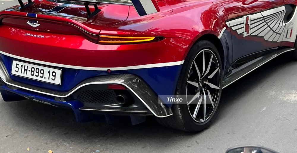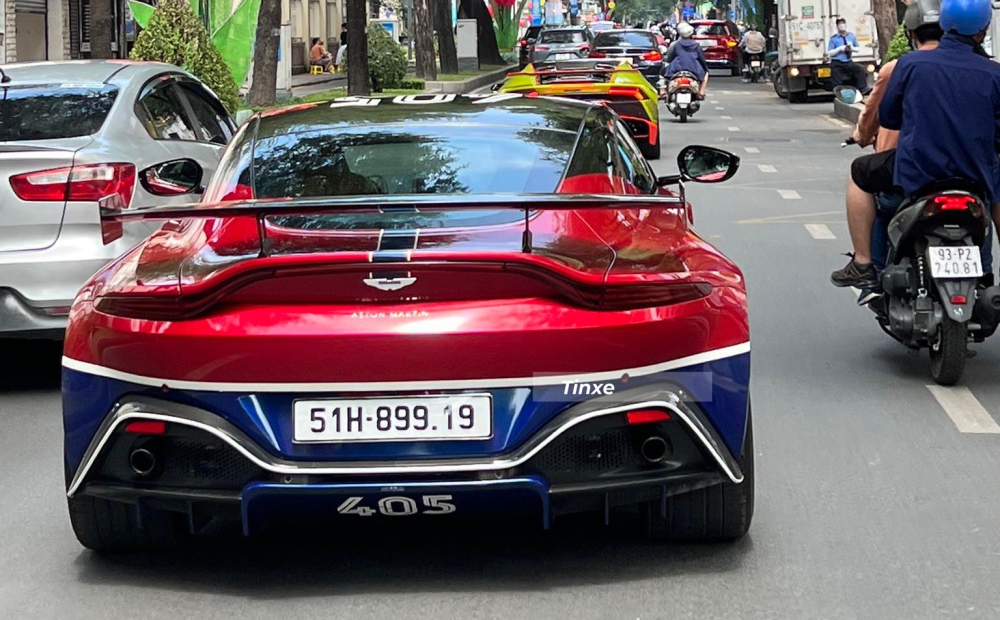 Vòng lên nóc xe Aston Martin V8 Vantage của Minh "Nhựa" có thể thấy xe xuất hiện con số 405 đặc trưng của đại gia này, cản va sau được dán lại màu xanh dương cùng con số ý nghĩa ở giữa khuếch tán sau. Hai bên cánh gió đuôi carbon của xe là đề-can 3 màu xanh dương, trắng và đỏ.