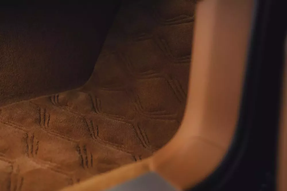 Cô ấy đã chọn những tông màu ấm áp cho nội thất xe, chẳng hạn như màu be, màu caramel, màu xanh nhạt làm điểm nhấn và đường chỉ khâu tương phản. Hình dáng của núi lửa Batur, nguồn cảm hứng cho tên gọi của chiếc xe, được thêu trên thảm trải sàn dày.