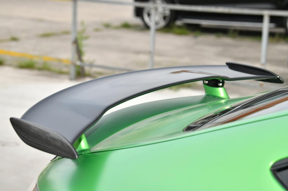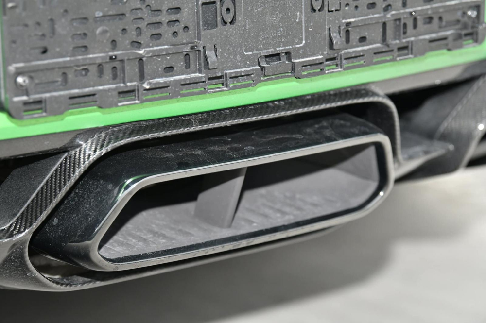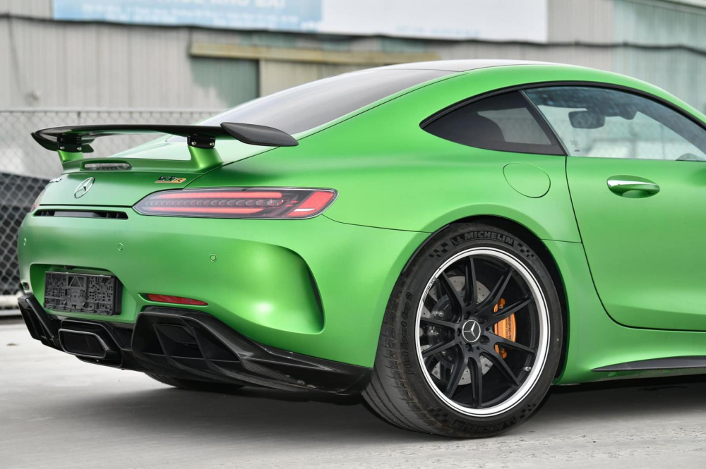 Chiếc siêu xe Mercedes-AMG GT R mới được nhập không chính hãng về nước không chỉ có màu xanh AMG Green Hell Magno mà ngoại thất còn có nhiều chi tiết carbon như cản va trước, vỏ gương, ốp sườn, ốp chia gió bên hông, mui xe hay khuếch tán sau. Tất nhiên còn có cánh gió đuôi cố định của xe cũng bằng carbon.