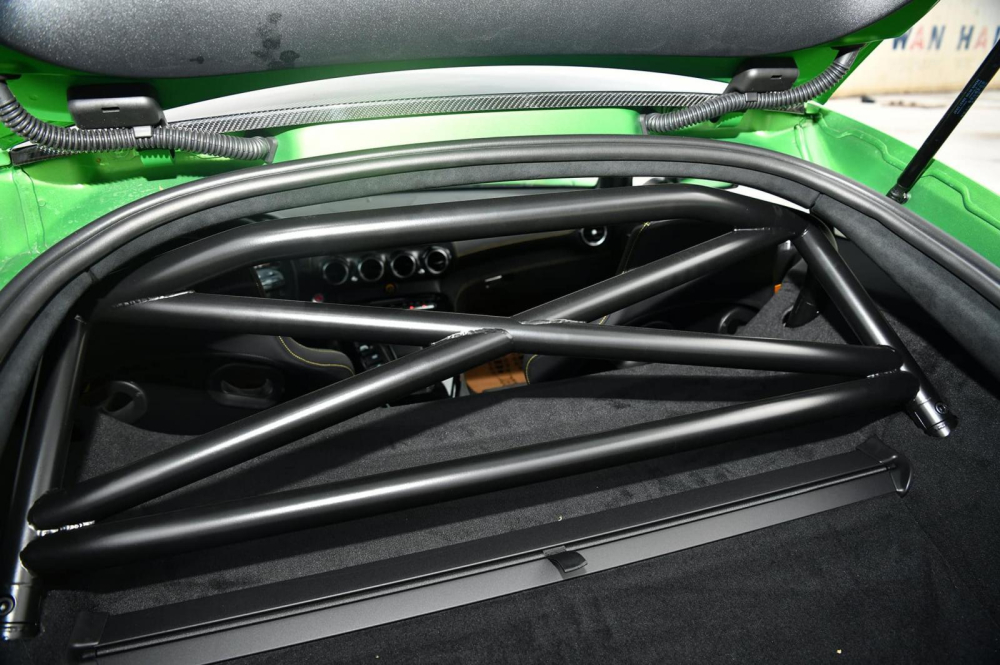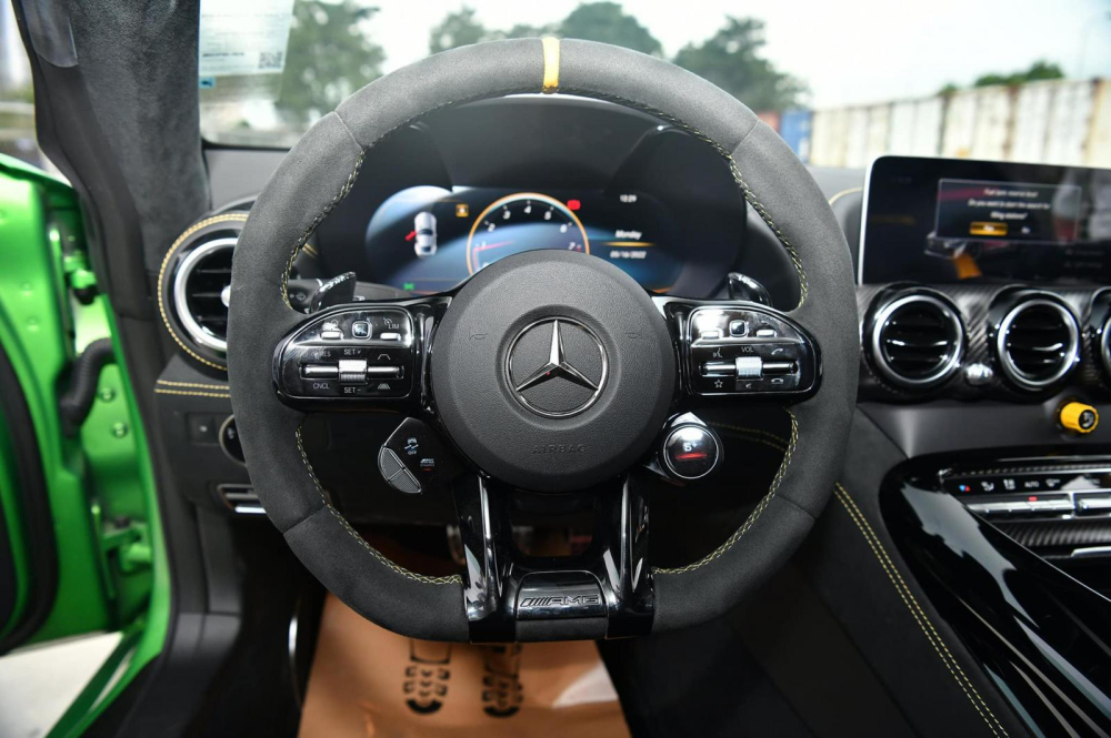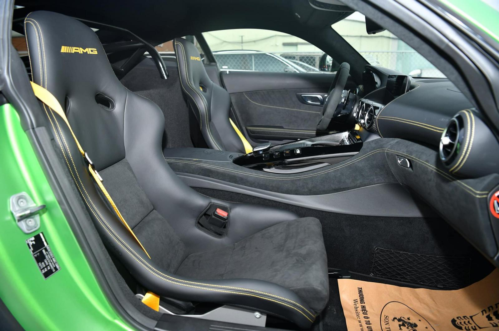 Mở cửa bước vào bên trong khoang lái siêu xe Mercedes-AMG GT R thứ 3 về Việt Nam sẽ thấy ngay bậc cửa được ốp carbon cùng dòng chữ AMG phát sáng, xe có ghế ngồi bọc da Alcantara với các chỉ may màu vàng, logo AMG và dây đai an toàn cũng được nhuộm vàng. Điểm ấn tượng trên xe Mercedes-AMG GT R màu xanh lá AMG Green Hell Magno được nhập tư về Việt Nam còn có trang bị khung chống lật.