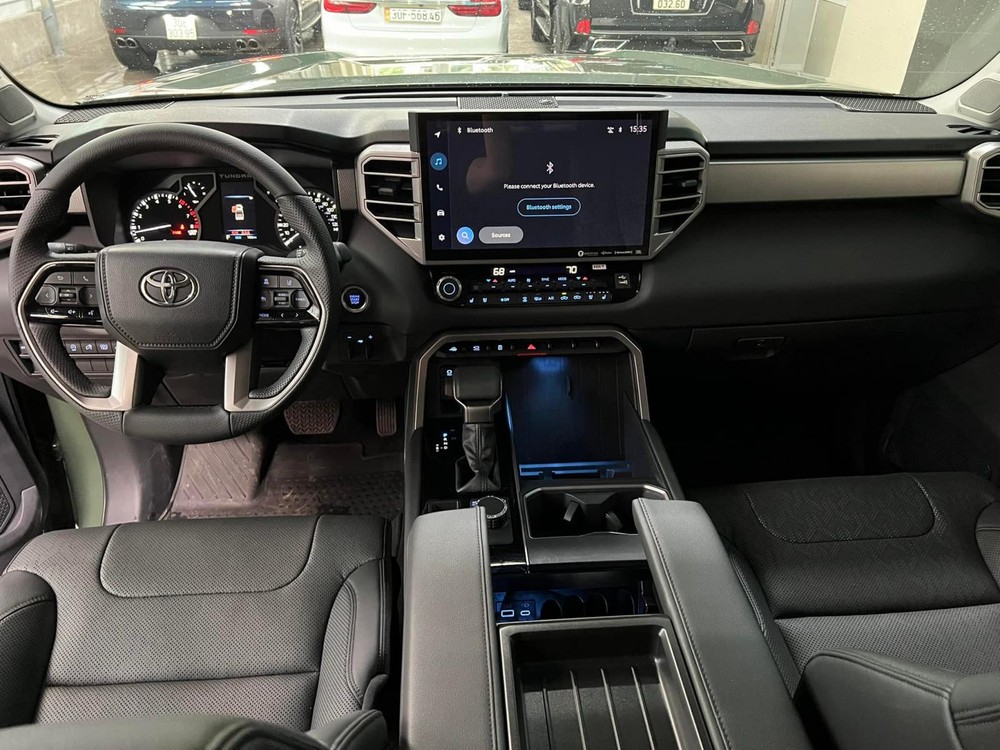 Bên trong khoang lái xe Toyota Tundra 2022 có bảng đồng hồ tích hợp màn hình màu đa thông tin 4,2 inch, vô lăng 3 chấu bọc da, tích hợp phím chức năng, hệ thống thông tin giải trí Toyota Audio Multimedia đi kèm màn hình cảm ứng 14 inch, điều hòa tự động 2 vùng độc lập và hệ thống lọc không khí.