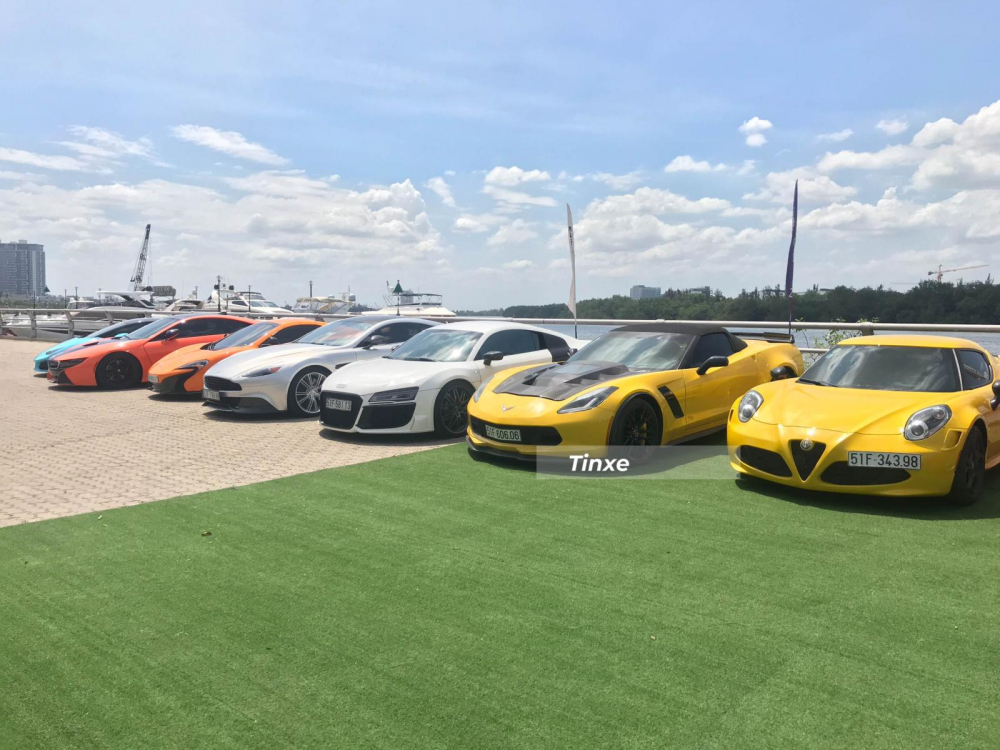 Aston Martin Vanquish đầu tiên về nước đỗ cùng Audi R8 độ và 2 xe màu vàng là Alfa Romeo 4C Launch Edition cùng Chevrolet Corvette C7 Z06 mui trần