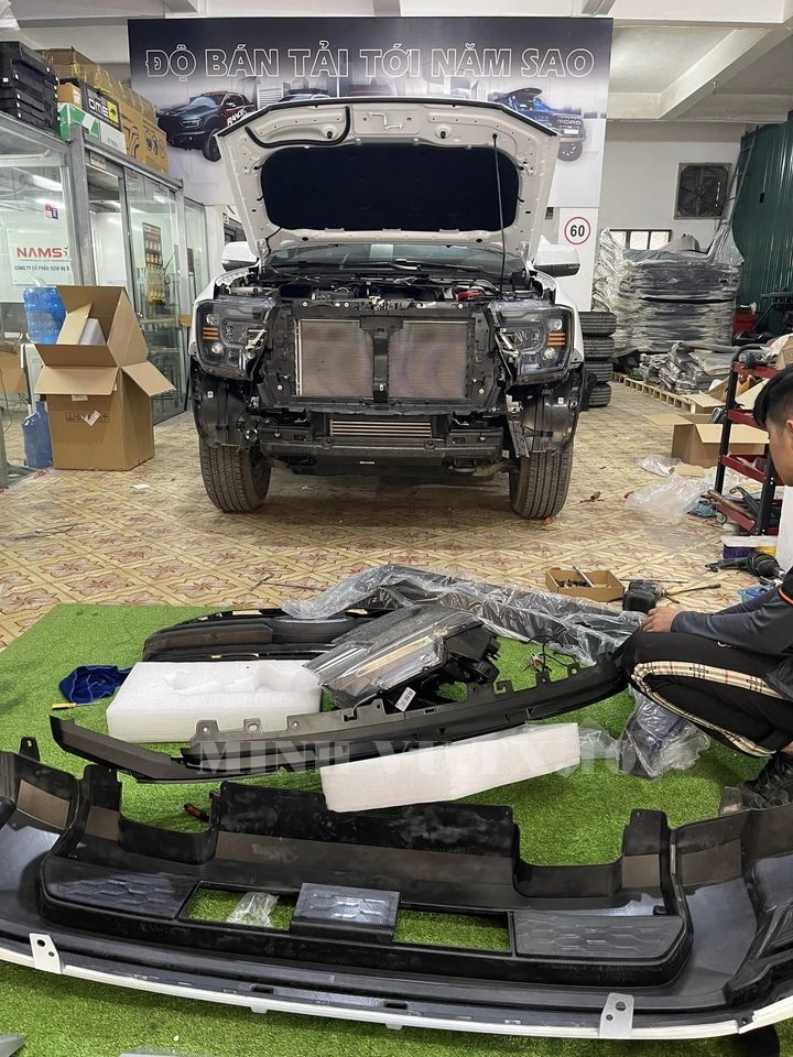 Quá trình độ nhẹ một chiếc xe bán tải Ford Ranger thế hệ mới lên bản Ford Ranger Raptor 2023 chỉ qua vài công đoạn như thay mặt ca-lăng, cản trước/sau và lên bộ tem Raptor bên hông thùng xe là được, nếu ai máu hơn thì độ mâm, phuộc và cả đèn mới.