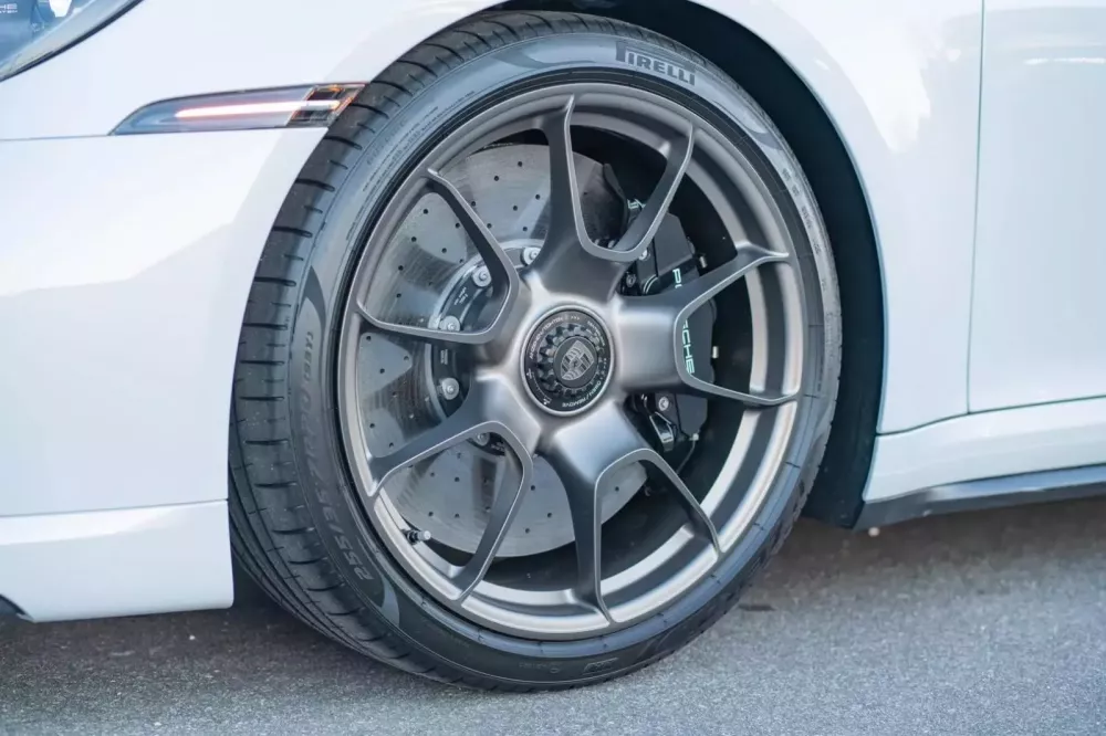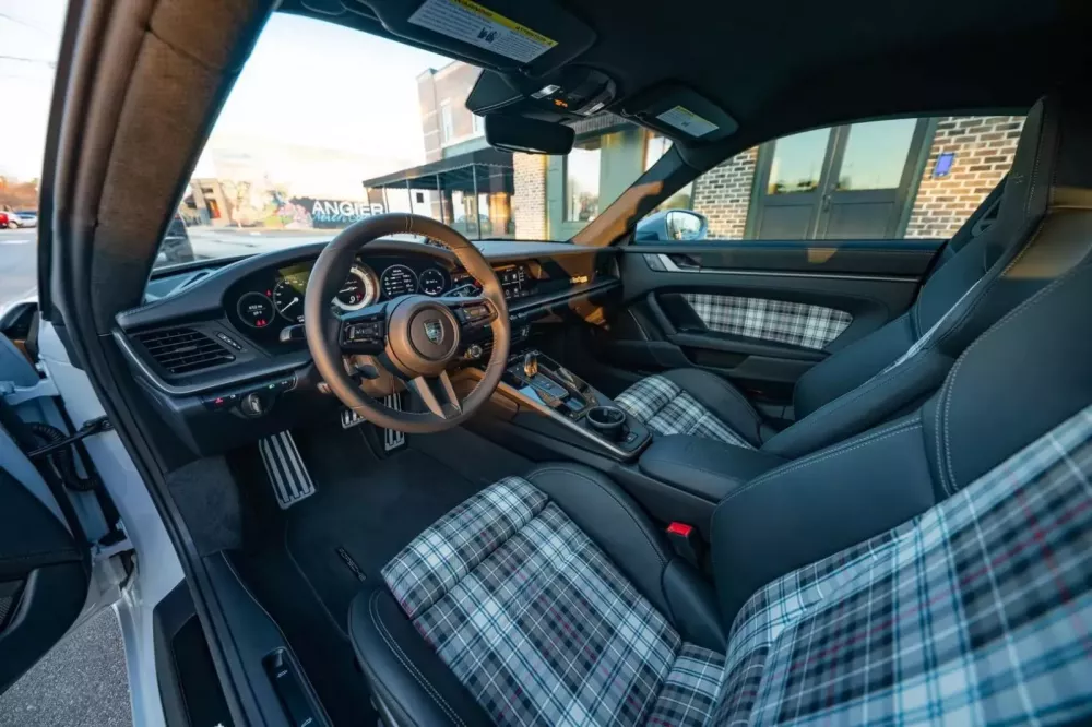 Bạn cũng được hưởng lợi từ hệ thống PASM và hệ thống lái trục sau. Tiếp theo là nội thất, ngoài tấm biển đặc biệt trên bảng điều khiển, chiếc 911 này được trang bị ghế Sport Plus chỉnh điện 18 hướng, bọc da đen với các chi tiết vải kẻ caro. Chúng trông khá tuyệt vời và cũng được thêu dòng chữ “Turbo 50”.