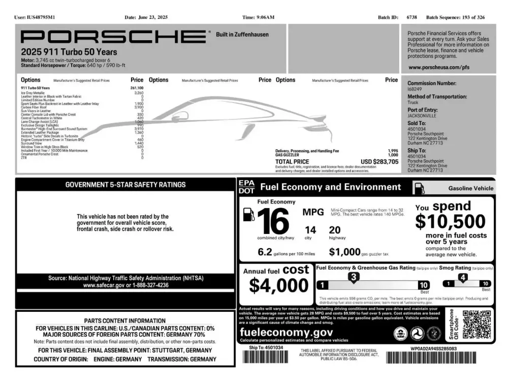Chiếc Porsche 911 đời 2025 này là chiếc thứ 1.784 trong tổng số 1.974 chiếc Turbo 50 Years được sản xuất trên toàn cầu, và thực tế được dựa trên cấu hình Turbo S. Nói cách khác, đây là một chiếc 911 phiên bản giới hạn, cực kỳ hiếm và đó là một thứ vô cùng quý giá trong thời điểm hiện nay.