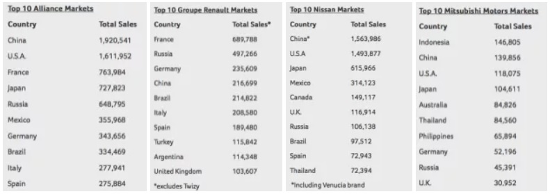 Top 10 thị trường của cả Liên minh, và lần lượt Renault, Nissan, Mitsubishi