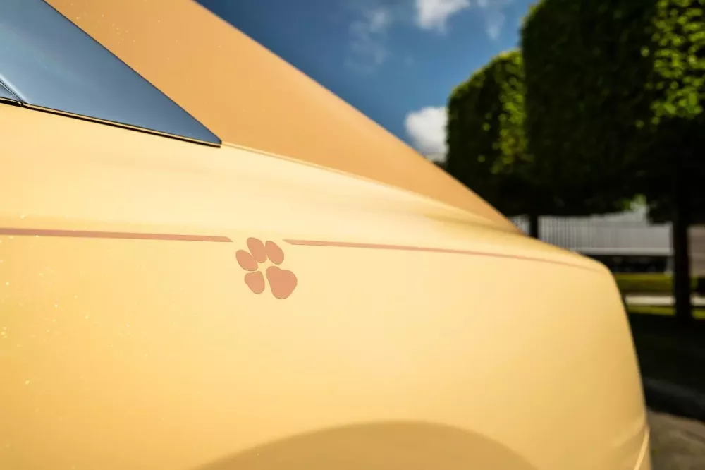 Lấy cảm hứng từ Bailey, chú chó Labrador-Golden Retriever, chiếc Spectre trên màn hình của bạn tái hiện chính xác dấu chân thú cưng của 1 đại gia - người đã lên ý tưởng cho hãng xe Rolls-Royce tạo ra sản phẩm độc nhất vô nhị này - cả bên ngoài lẫn bên trong. Dấu chân dọc theo đường coachline ở bên hông được sơn thủ công bằng vàng hồng, một tông màu trùng với biểu tượng Spirit of Ecstasy ở đầu xe.