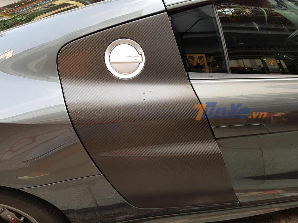Tương tự đó là phần ốp hốc gió bên hông siêu xe Audi R8 V10 Coupe cũng được nhìn thấy có diện mạo mới bằng carbon mờ. Hiện chưa rõ chi tiết này được thay mới hoàn toàn bằng carbon hay là sản phẩm của dán đề-can. Trước đó chi tiết này có màu bạc.