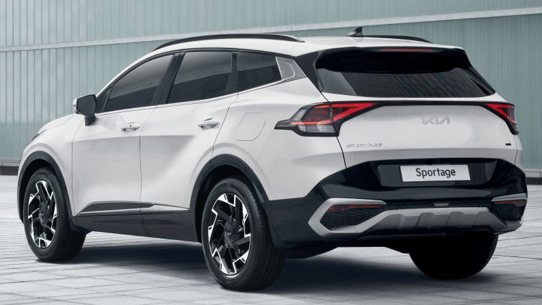 Cách bố trí các chi tiết crôm bóng trên mỗi xe cũng khác nhau, Kia Sportage sở hữu ốp chữ L bao lấy mép dưới cửa kính xe, trong khi đó ốp crôm trên Tucson kéo dài từ mép trên cửa trước cho đến tận kính cửa cốp. Sự đối lập về thiết kế giữa Kia Sportage và Hyundai Tucson tiếp tục được thể hiện rõ ở đuôi xe. Cả hai đều được có cụm đèn hậu kéo dài và kết nối với nhau bằng dải đèn LED ở giữa, nhưng thiết kế đèn hậu xe Sportage lấy cảm hứng từ mẫu Stinger với phần đuôi đèn kéo dài về phía vòm bánh sau. Mặt khác, đèn hậu xe Hyundai Tucson lại có tạo hình răng nanh quặp vào, như bao lấy phần biển số. Trong khi đó Kia bố trí nơi bắt biển số cho Sportage khá thấp, tích hợp vào phần cản sốc sau và ngay phía trên ốp bảo vệ gầm xe.