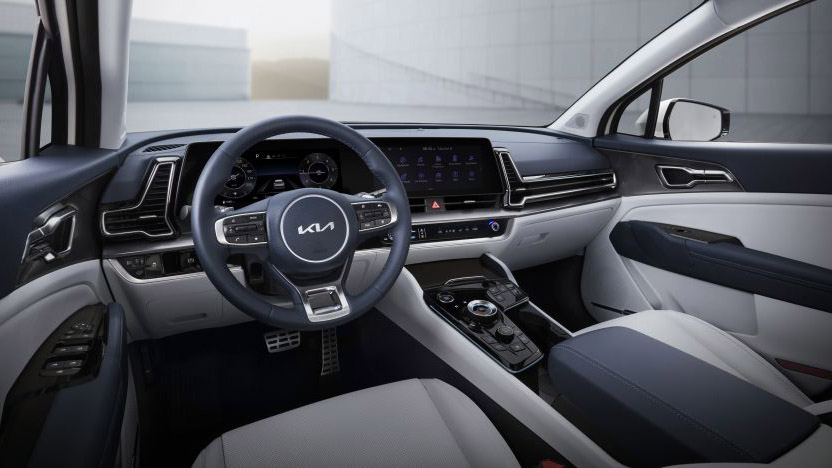 Tương tự vẻ ngoài, Kia và Hyundai dù có chung đích đến là thiết kế theo hơi hướng tương lai, nhưng mỗi hãng lại chọn cho mình một lối đi riêng. Với Kia Sportage, tâm điểm bên trong khoang lái của xe chính là màn hình cong kích thước lớn hiển thị cả bảng đồng hồ lẫn hệ thống giải trí, hốc gió điều hòa được bố trí ở hai bên, kéo trải hết chiều dài của bảng táp lô. Bên dưới là bảng điều khiển dạng cảm ứng có thiết kế mảnh, bảng điều khiển trung tâm với cụm phím chức năng và núm xoay chuyển số được bố trí nhô cao.