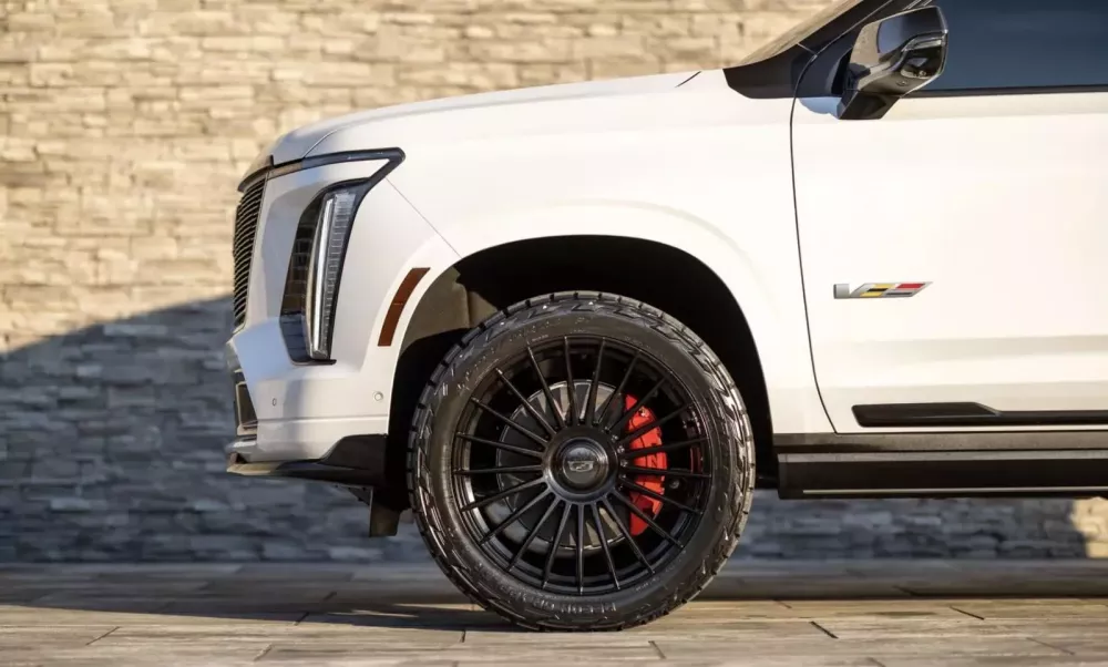 Chiếc xe trong bài có hệ thống treo nâng cao mang lại dáng vẻ uy nghi và mạnh mẽ, kết hợp hoàn hảo với bộ mâm Vossen 24 inch đồ sộ. Lưu ý rằng Escalade nguyên bản chỉ được trang bị bộ mâm tối đa 23 inch. Bánh xe được bọc bằng lốp Nitto 35 inch có độ bám đường cao, không chỉ làm tăng vẻ ngoài mà còn cải thiện khả năng di chuyển trên đường và khả năng off-road.