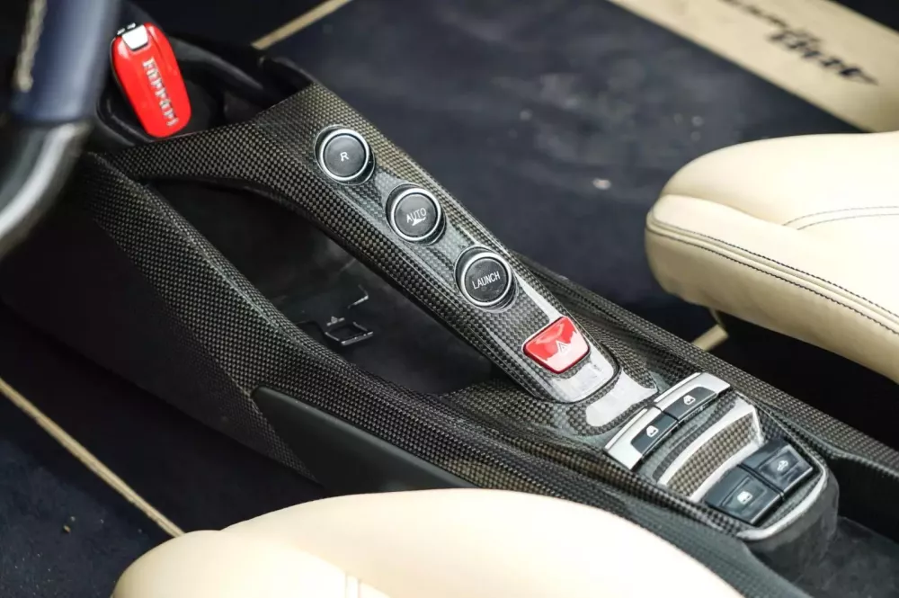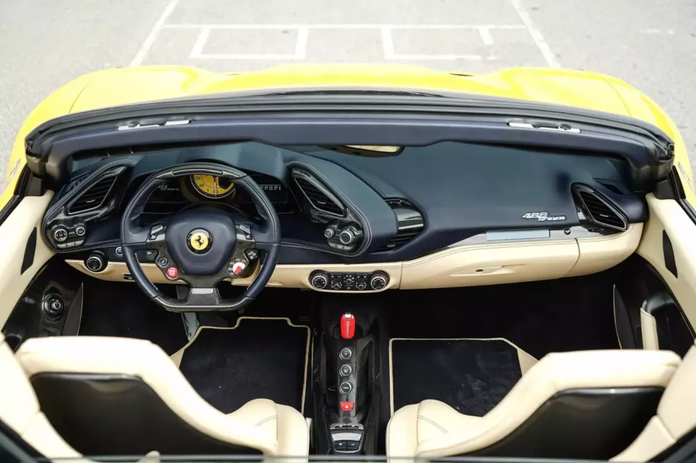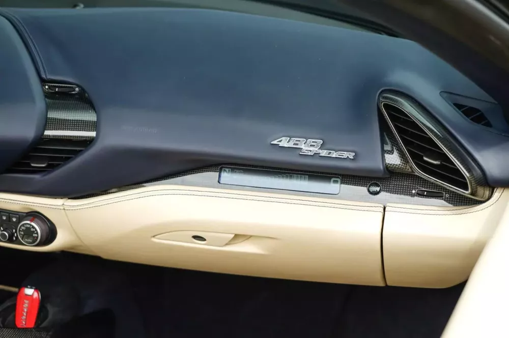 Nội thất chiếc siêu xe mui trần Ferrari 488 Spider này có màu kem, đi kèm nhiều sọc màu xanh, và lưng ghế carbon. Trước mặt ghế phụ có 1 màn hình nhỏ thể hiện tốc độ cùng nhiều thông số khác.