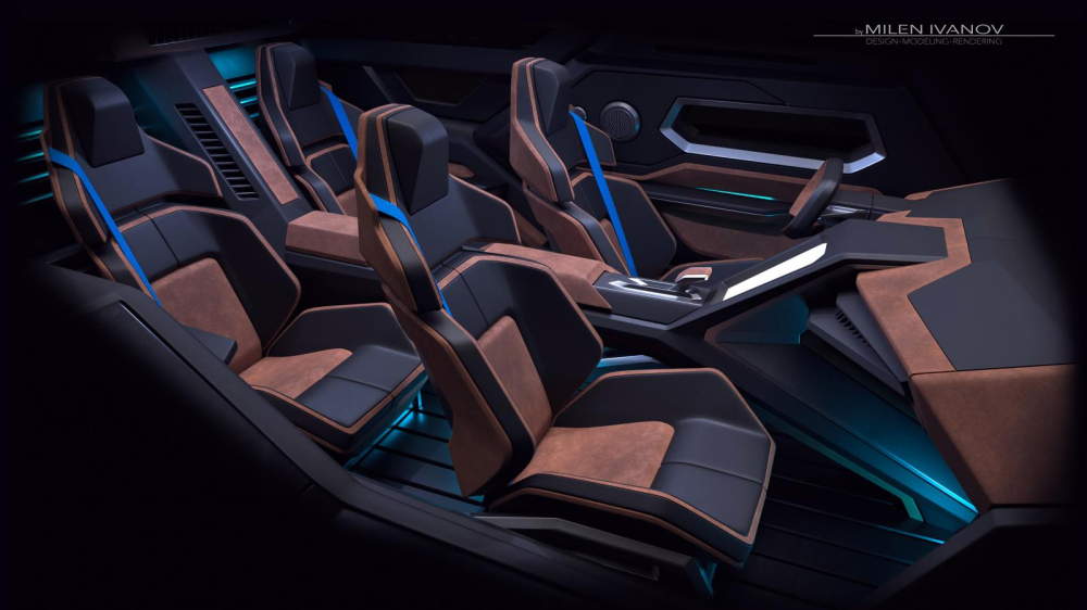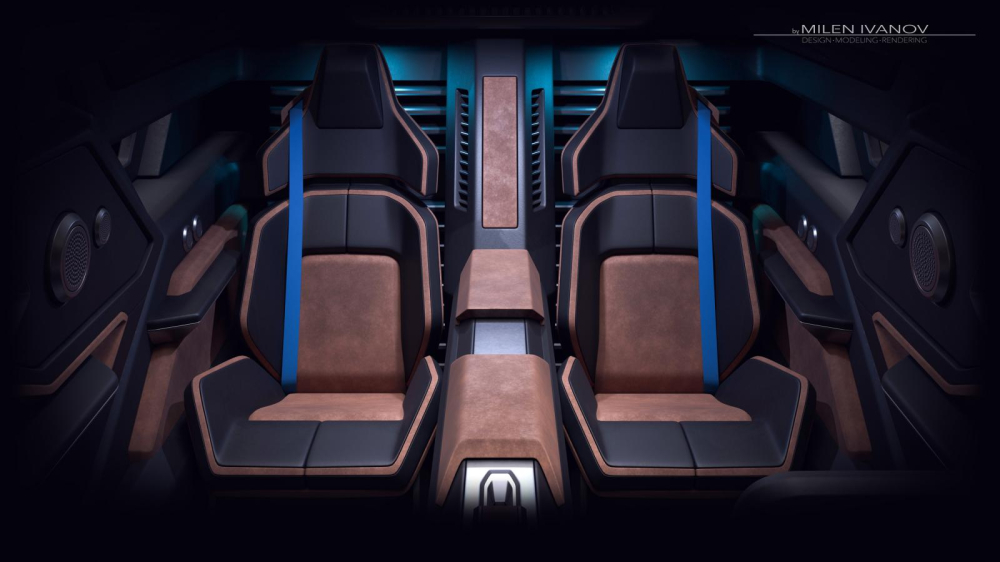 Phong cách hiện đại và cứng cáp không chỉ được nhấn mạnh ở ngoại hình mà còn thể hiện rõ bên trong khoang nội thất của xe. Hệ thống đèn chiếu sáng bên trong cũng có màu xanh, soi rõ hệ thống ghế ngồi với thiết kế rắn rỏi. Có vẻ như ghế ngồi của xe đều được bọc da lộn Alcantara màu nâu và da thuộc màu đen, kết hợp cùng màu xanh dương giống với đèn chiếu sáng.