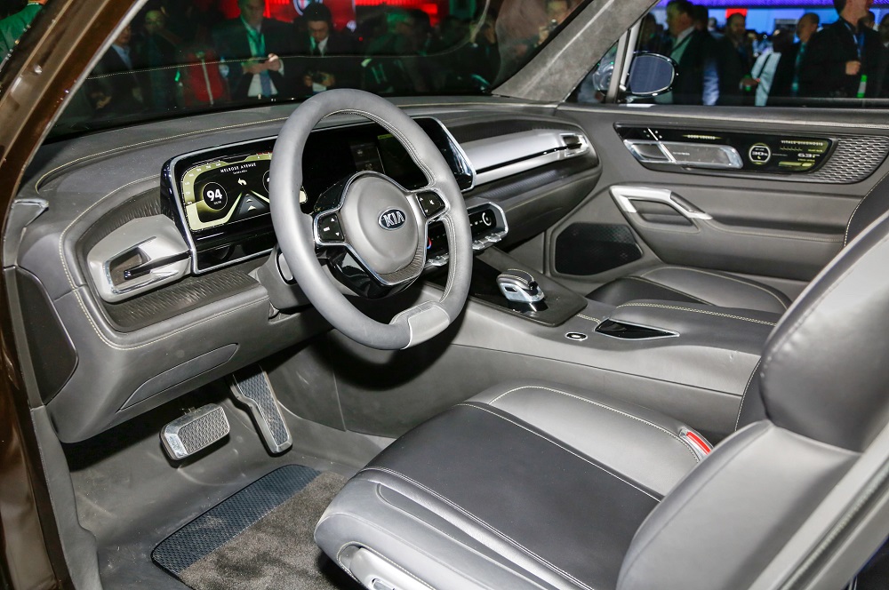 Bên trong Kia Telluride tại triển lãm là 4 ghế thương gia độc lập và 1 ghế dài ở sau cùng. Dự đoán, Kia Telluride phiên bản thương mại sẽ có bố trí nội thất thông thường hơn. Chẳng cần phải nói, cửa mở ngược của Kia Telluride sẽ không được đưa vào phiên bản sản xuất.