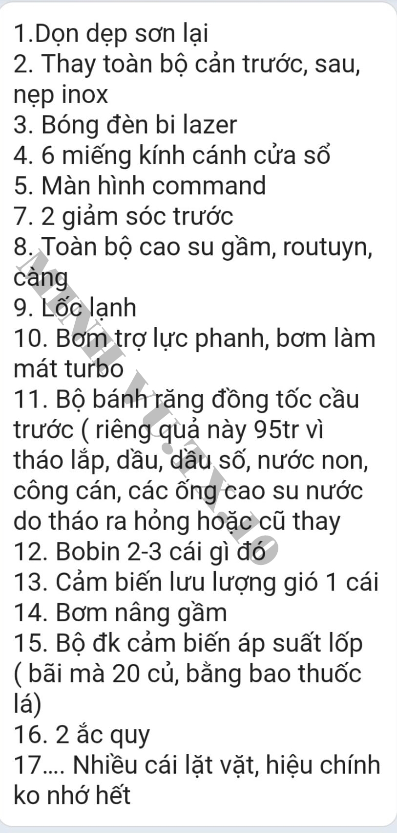 Các món đồ thay nặng tiền nhất bao gồm cảm biến áp suất lốp hơn 20 triệu đồng, là hàng đã qua sử dụng, còn xài được, bộ bánh răng đồng tốc cho cầu trước gần 100 triệu đồng, màn hình giải trí, bơm trợ lực phanh và làm mát turbo hay bộ body kit của bản Bentley Continental Flying Spur Speed.