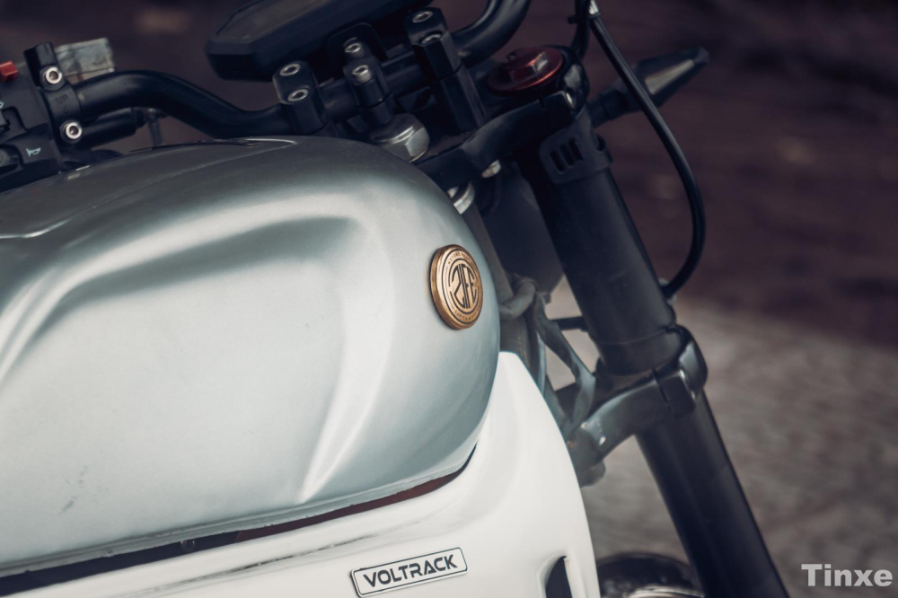 Voltrack được hoàn thiện với rất nhiều những chi tiết được nâng cấp và sửa đổi để sở hữu kiểu dáng mượt mà nhất có thể. Theo quan sát, bản độ có điểm nhấn lớn nhất nằm ở khu vực thân xe với bộ ốp kim loại được sơn gò hoàn toàn mới. Bộ ốp này được hoàn thiện theo đúng kiểu dáng của khung đỡ bộ pin và hệ thống điện trên xe, đạt hiệu quả thẩm mỹ rất cao dưới bộ màu trắng xám cam.