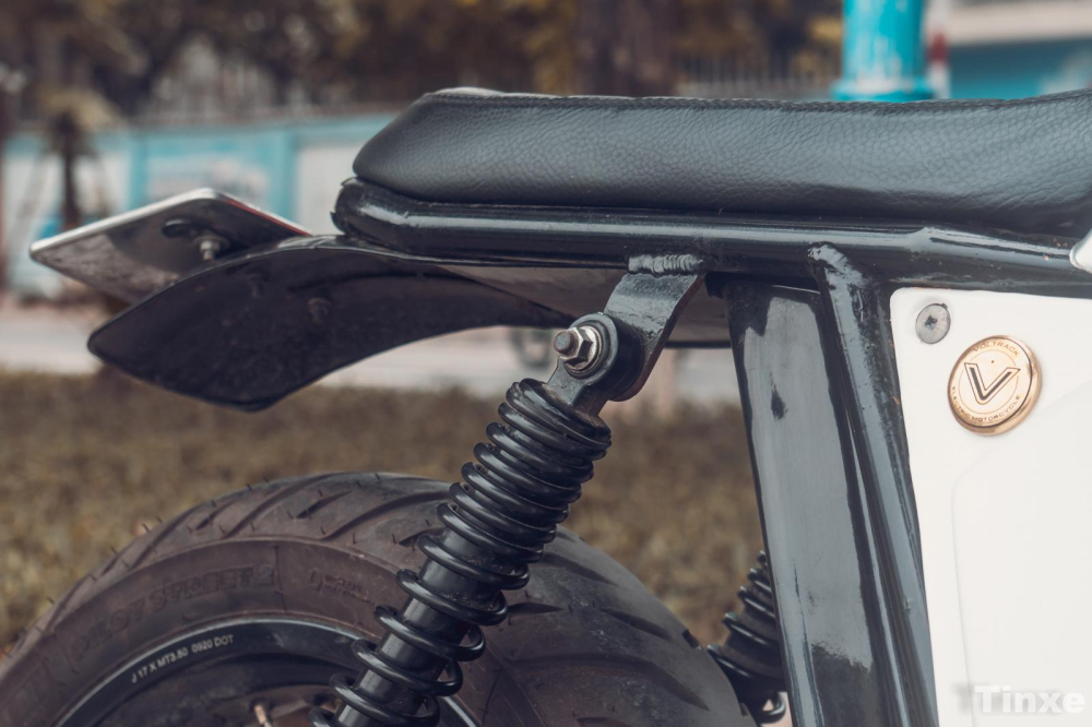 Tiếp đó, Zife Design đã làm tăng cái chất mô tô của chiếc xe điện bằng một bộ bình xăng lớn được gò thủ công rất phù hợp với dáng xe. Bình xăng có thiết kế theo kiểu giọt nước được làm tinh tế có nhiều tác dụng với người lái. Cụ thể, bình xăng lớn này vừa có khả năng giúp người lái ngồi trên xe vững chắc hơn, vừa là cốp xe giả bình xăng, cung cấp thêm diện tích để đồ cho người lái.